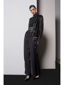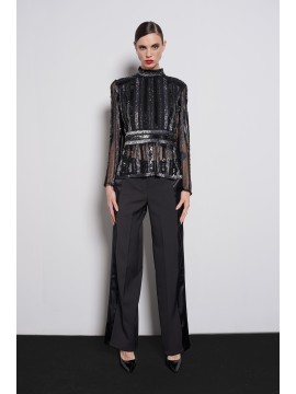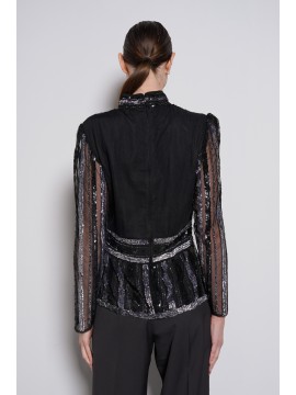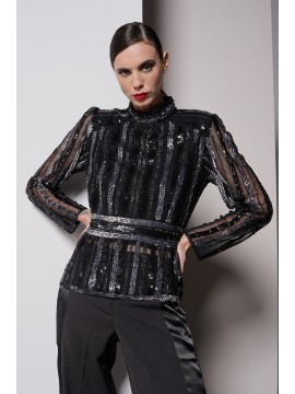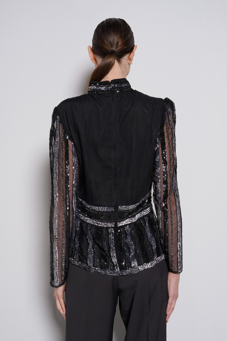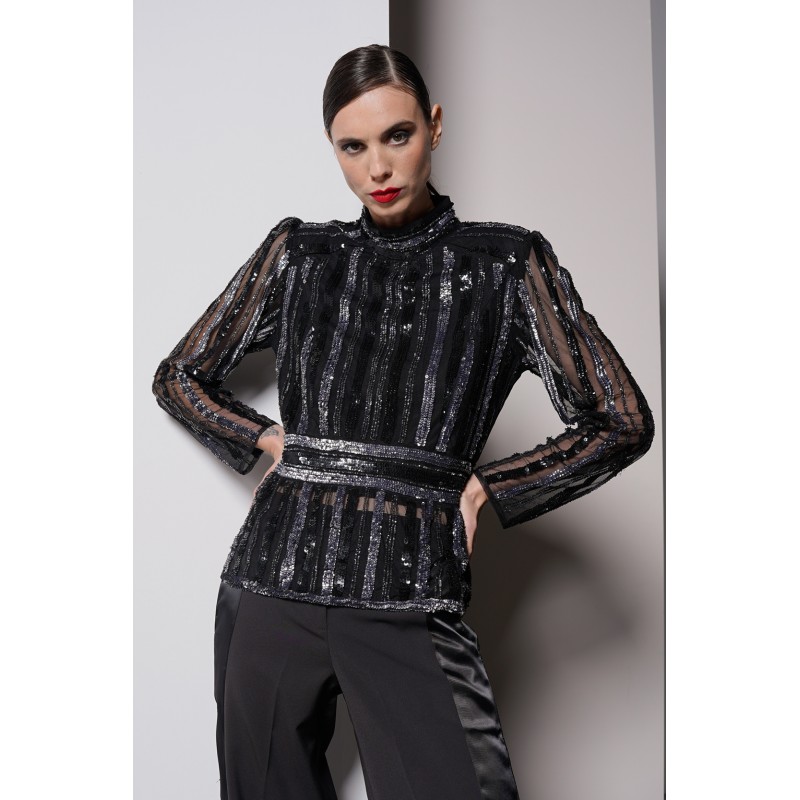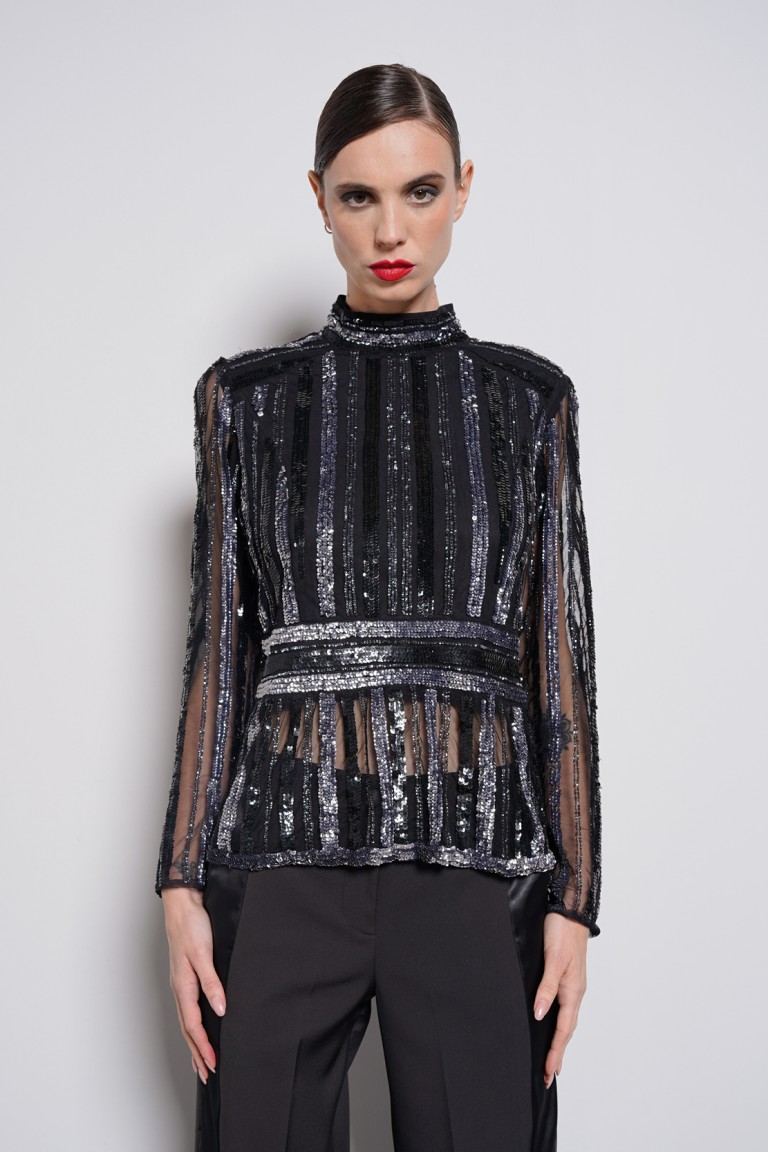 Blusa avvitata, maniche lunghe. Dettaglio ricamo paillettes. Chiusura con zip invisibile sul dietro. La modella è alta 1,78 cm ed indossa una taglia S.