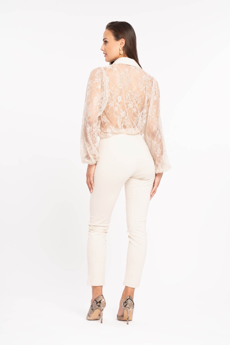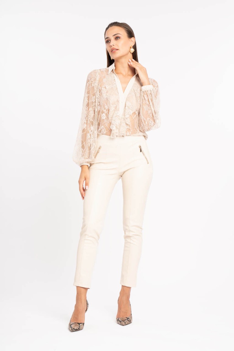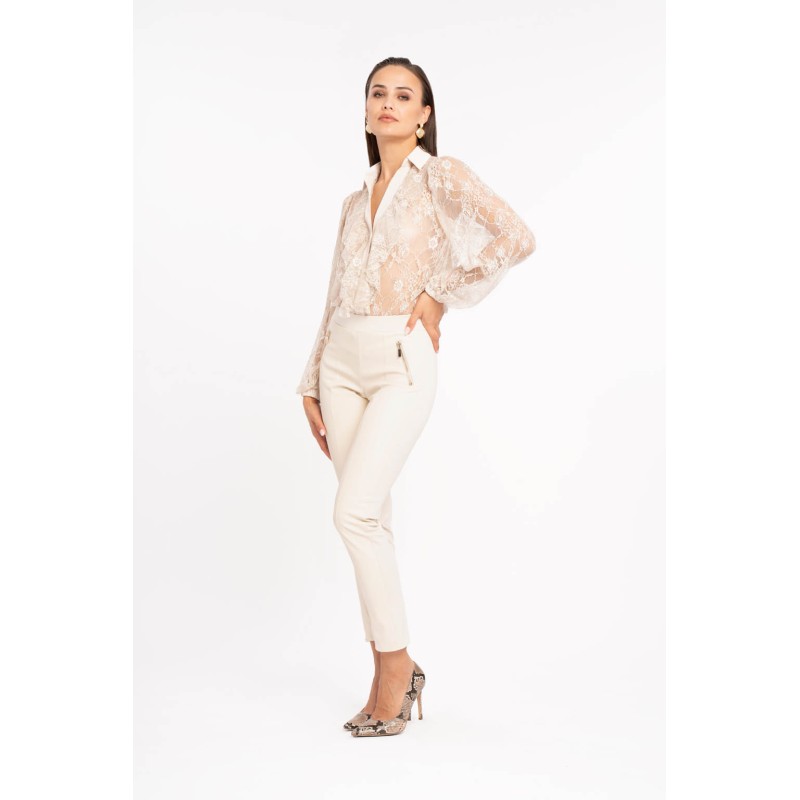Pantalone bimaterico, davanti ecopelle retro punto milano. Modello leggins bustino elastico, impunture frontali e tasche con zip in metallo. Linea aderente. Vestibilità regolare.