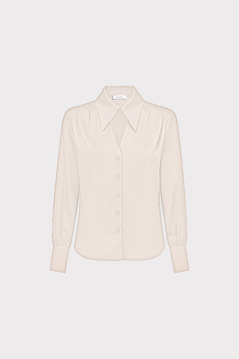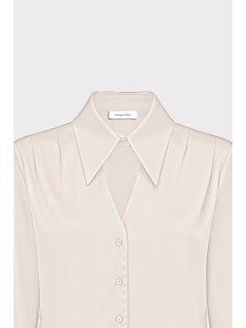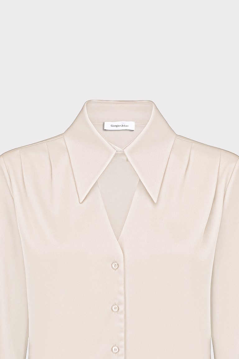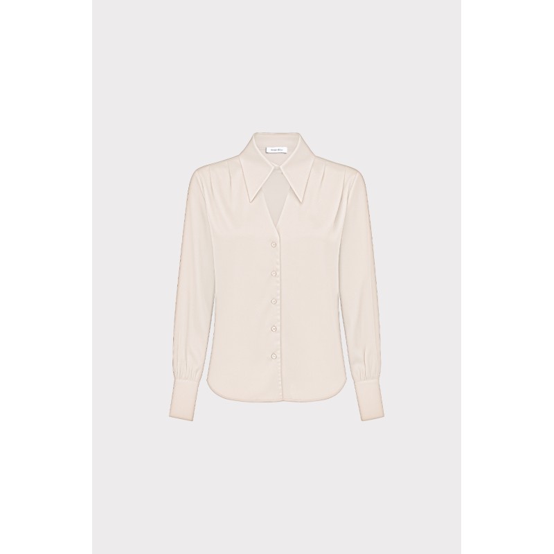 Camicia elegante in raso satin, Il colletto classico e le maniche lunghe disegnano una silhouette raffinata, adatta tanto a un meeting di lavoro quanto a una cena elegante. Tessuto lucido per un look femminile e raffinato. È il capo che parla di femminilità decisa
