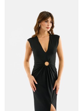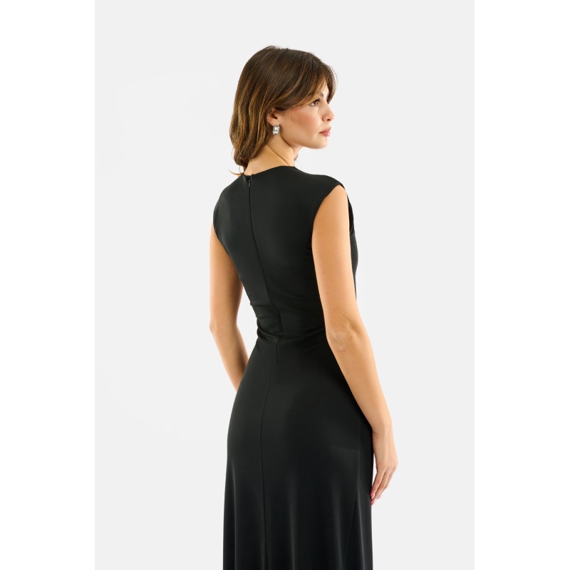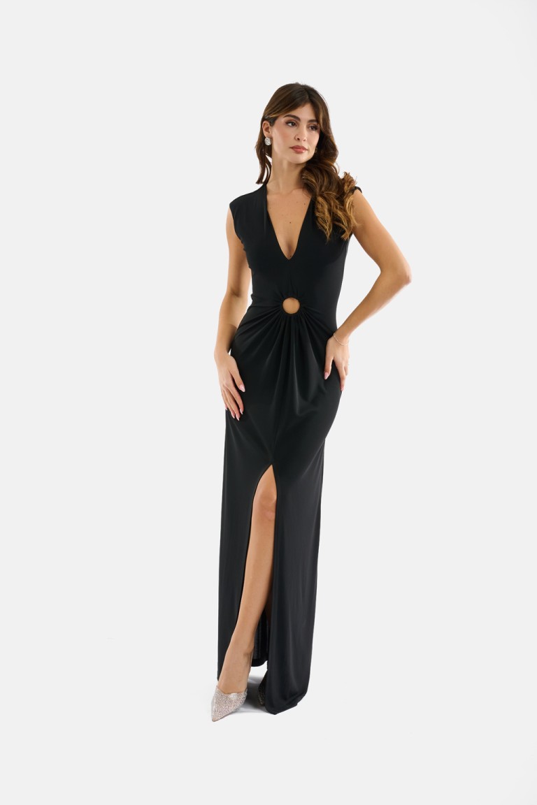 Abito lungo elegante caratterizzato da un profondo scollo a V e da un nodo centrale ad anello che crea un drappeggio morbido e slanciante. La linea scivolata valorizza la silhouette senza segnare, mentre la chiusura posteriore con zip garantisce una vestibilità impeccabile.Perfetto per cerimonie, eventi serali e look refined dal fascino essenziale.
