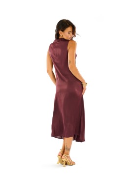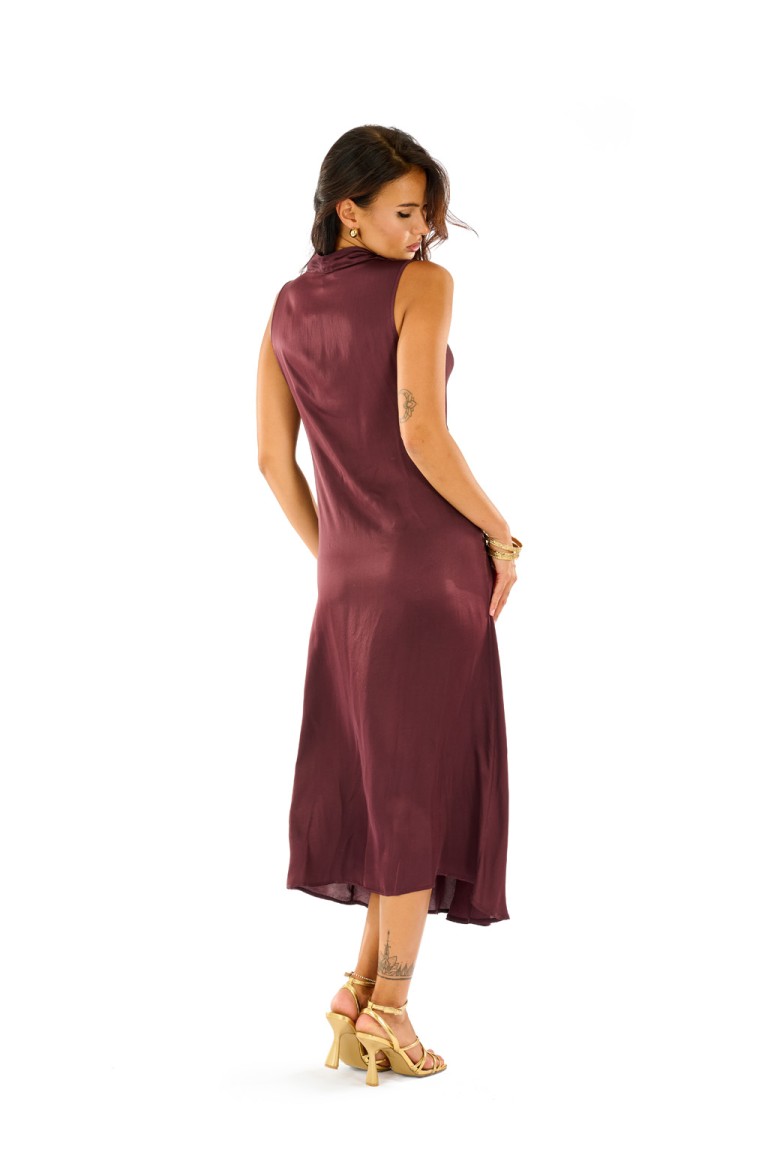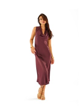 Abito lungo da donna in raso di viscosa con profondo scollo drappeggiato. Senza maniche e dal taglio sinuoso, è perfetto per cerimonie, eventi serali o occasioni speciali.
