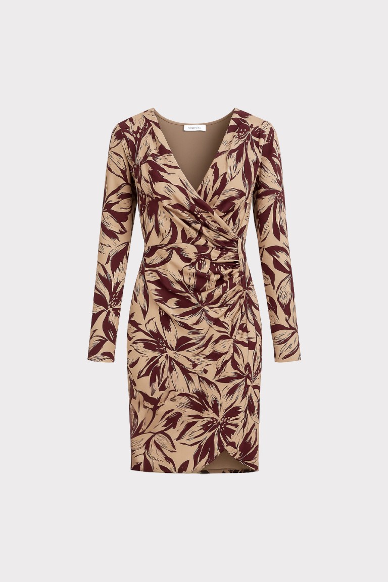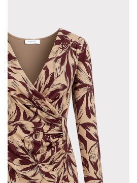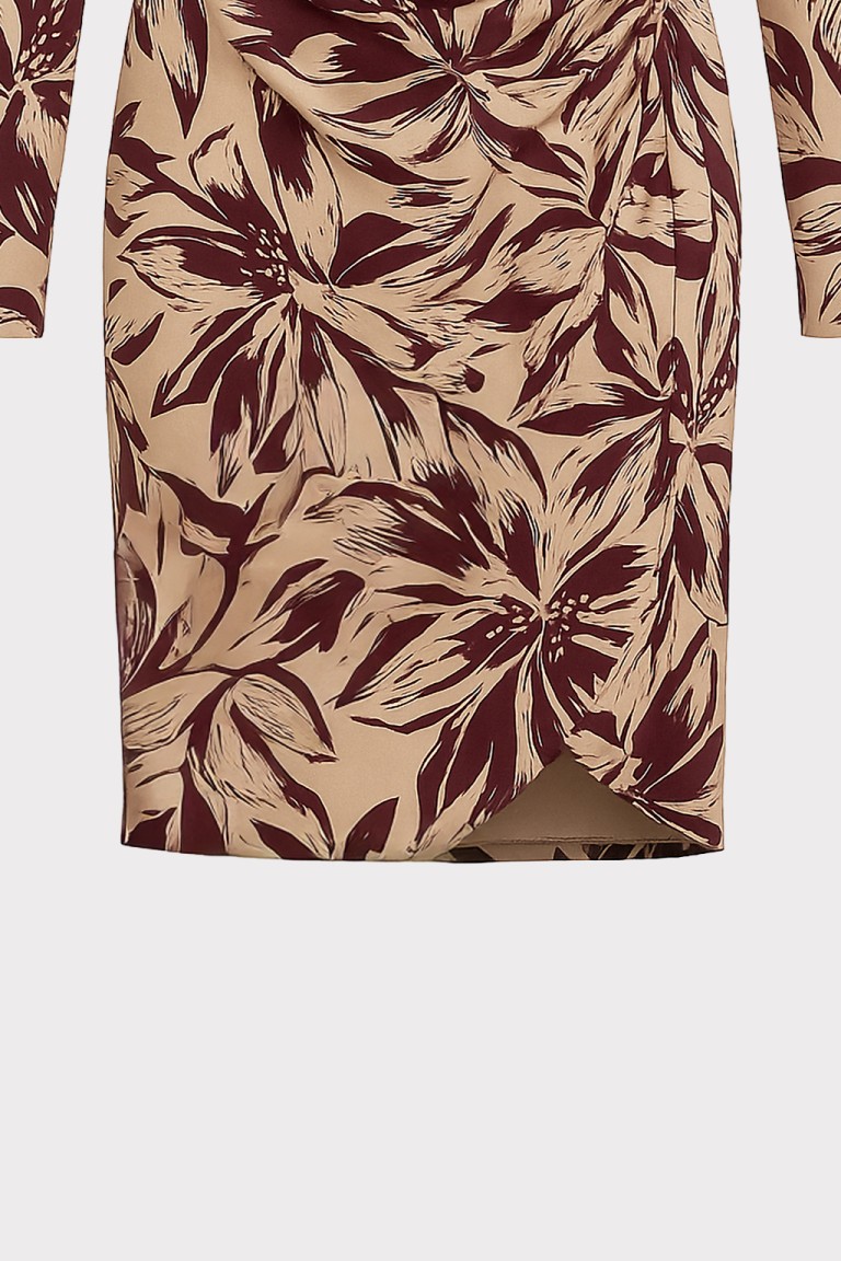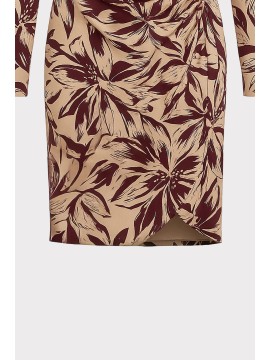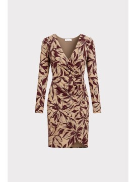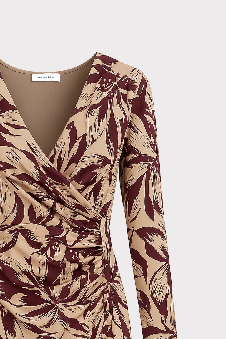 Abito corto in tessuto elasticizzato con stampa foliage nei toni del bordeaux e crema. Modello incrociato con drappeggio laterale e scollo a V, pensato per valorizzare la silhouette. Maniche lunghe aderenti e lunghezza sopra al ginocchio. La costruzione in tessuto fluido garantisce comfort e aderenza, ideale per un look femminile e versatile dal giorno alla sera. Adatto a una donna dinamica e raffinata, che cerca un capo pratico ma dimpatto. Perfetto con stivali alti o décolleté per un effetto più elegante.