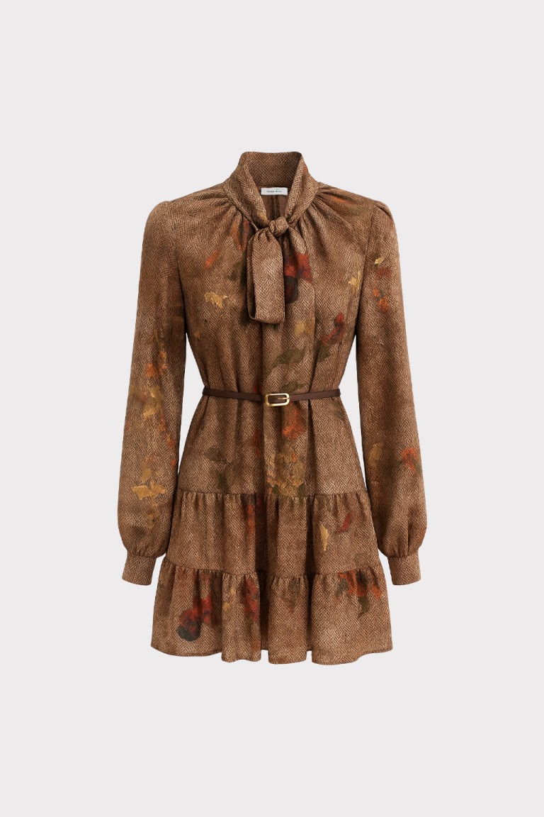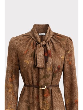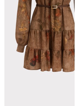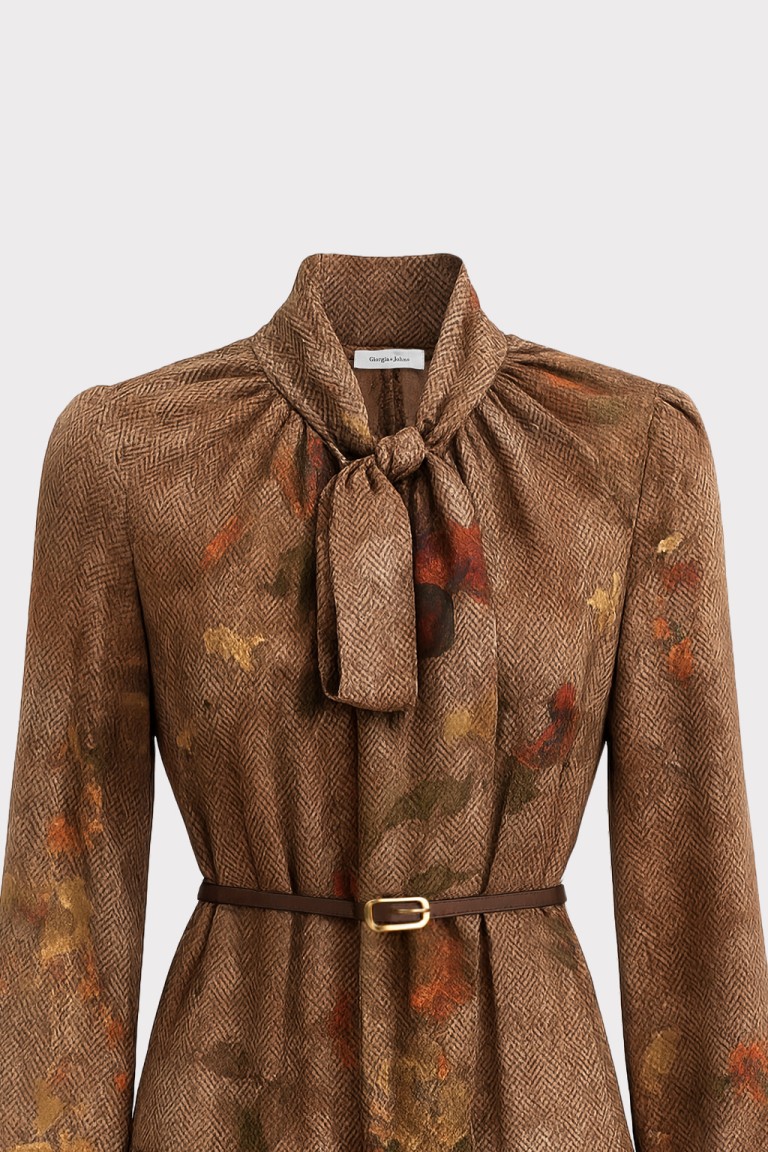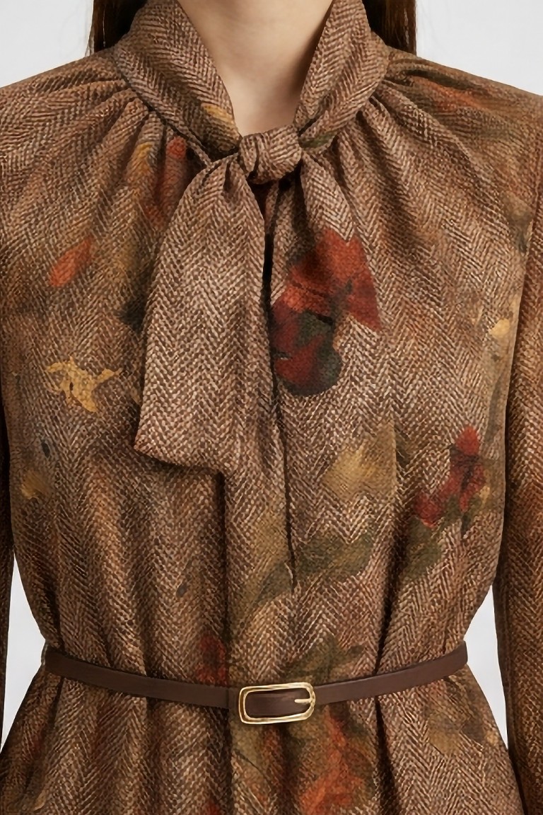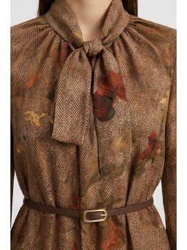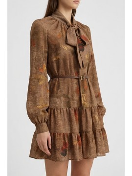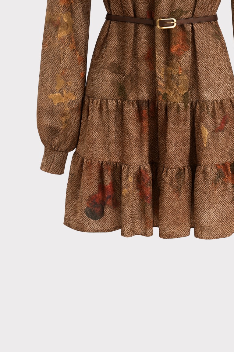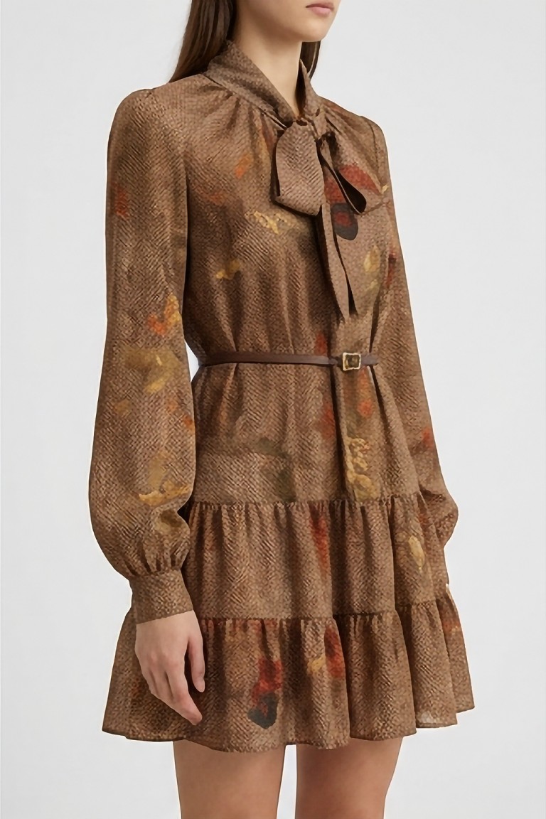 Questo abito corto in chiffon si distingue per la sua stampa floreale ad effetto acquerello, che si fonde armoniosamente con una base tessile a micro disegno spigato. Il contrasto tra il fondo strutturato e i fiori sfumati dona profondità e movimento al capo, creando un equilibrio elegante tra classicità e modernità. Lo scollo a V con laccetto da annodare aggiunge un dettaglio femminile e personalizzabile, mentre la cinturina definisce delicatamente la vita. Le maniche leggere a tre quarti e lorlo mosso con balza completano una silhouette fluida e versatile, ideale per interpretare lo stile con naturalezza e comfort in ogni occasione.