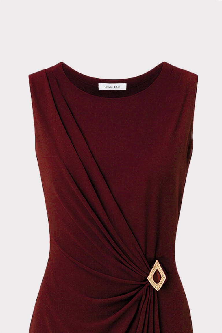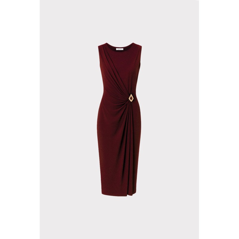 Abito lungo caratterizzato da un elegante gioco di drappeggi che si concentra sul fianco, impreziosito da una luminosa applicazione gioiello. La linea scivolata e la lunghezza full length slanciano la figura con naturalezza. Il modello senza maniche lo rende ideale per serate formali, cerimonie e occasioni che richiedono un look più ricercato e femminile