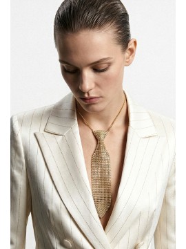 Collana lunga dal design iconico e contemporaneo, caratterizzata da un maxi pendente a forma di cravatta interamente ricoperto di cristalli luminosi. Un accessorio scenografico e di forte impatto visivo, pensato per valorizzare ogni look con eleganza e personalità. La silhouette allungata slancia la figura, mentre la lavorazione brillante crea giochi di luce raffinati ad ogni movimento. Perfetta per outfit serali, eventi speciali o per dare un twist glamour anche agli abbinamenti più essenziali