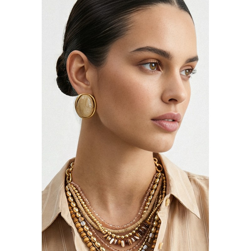 Valorizza ogni look con questi orecchini ovali dal design raffinato, caratterizzati da inserti effetto pietra con finitura luminosa e cornice color oro. La forma morbida e leggermente irregolare dona un tocco contemporaneo, perfetto per completare outfit sia quotidiani che più eleganti. Questi orecchini sono ideali per soddisfare gusti diversi e creare proposte sempre attuali. Leggeri e facili da indossare, rappresentano un accessorio must-have per ogni stagione.