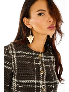 Orecchini pendenti dallo stile moderno e deciso, caratterizzati da una catena a maglia quadrata che sostiene un doppio triangolo sovrapposto. La base lucida, in contrasto con il triangolo dorato centrale, crea un gioco grafico elegante e dimpatto. Leggeri e versatili, sono perfetti per chi ama accessori bold e contemporanei. Ideali per outfit moderni, serate glamour o look urban chic