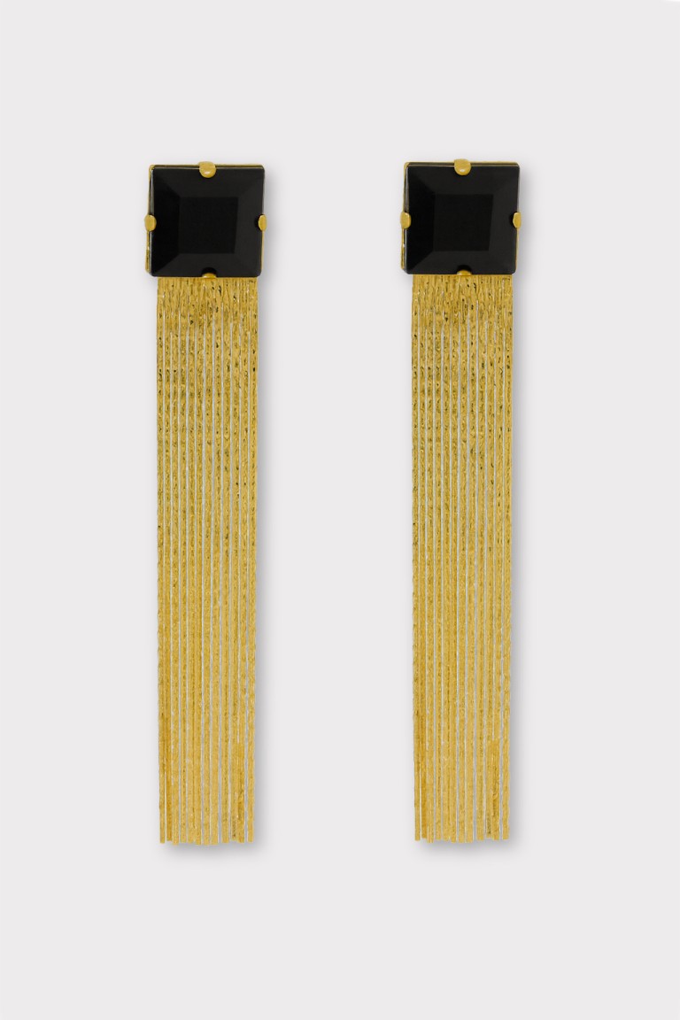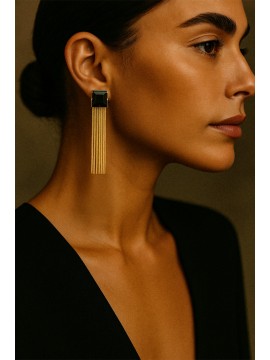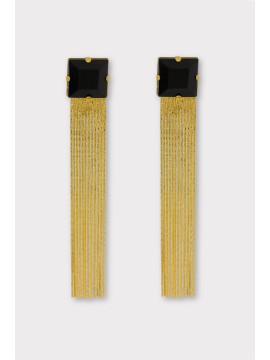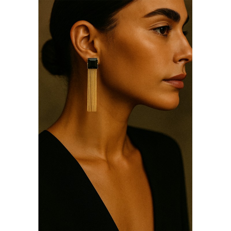 Orecchini pendenti raffinati e scenografici, impreziositi da una pietra nera sfaccettata a taglio quadrato che cattura la luce con eleganza. Dal castone partono lunghe frange in catena dorata che creano movimento ad ogni passo, regalando dinamismo e fascino. Ideali per completare look da sera e outfit sofisticati, questi orecchini uniscono stile glamour e femminilità.