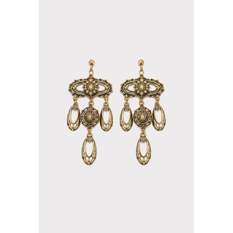 Orecchini pendenti dal fascino etnico e retrò, realizzati in metallo dorato anticato con dettagli floreali e geometrici. La struttura lavorata a rilievo richiama l’artigianalità tradizionale, mentre gli elementi ovali e rotondi pendenti donano movimento e leggerezza. Un accessorio ricco di personalità, perfetto per chi ama gioielli dallo stile boho-chic e senza tempo.