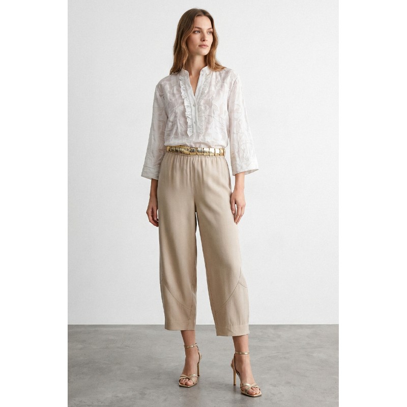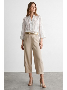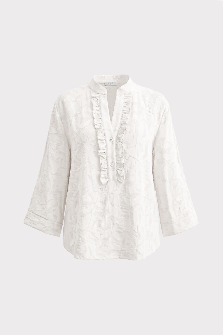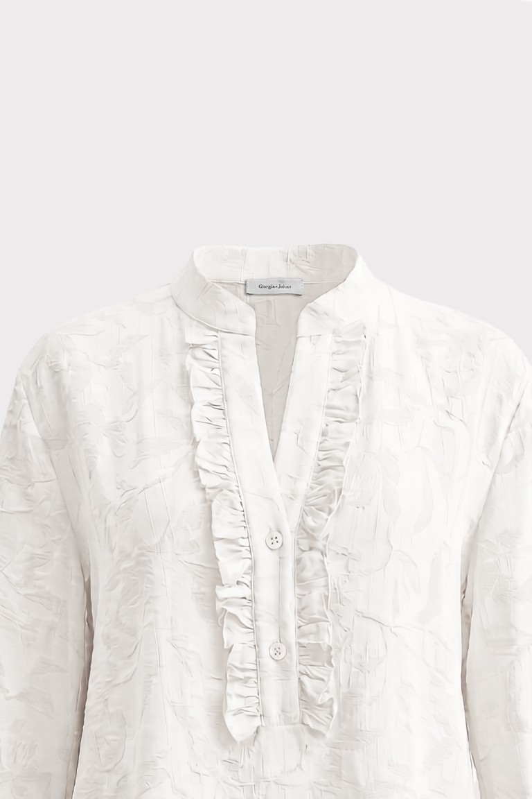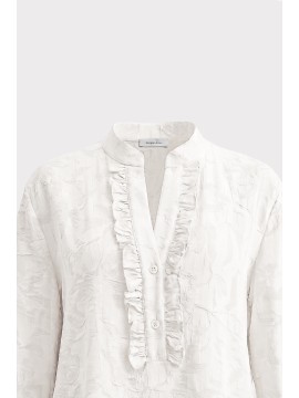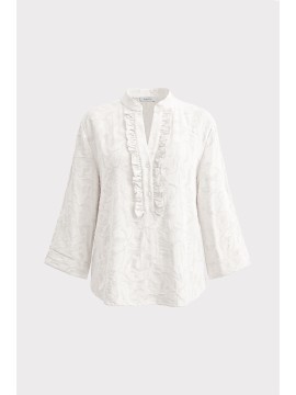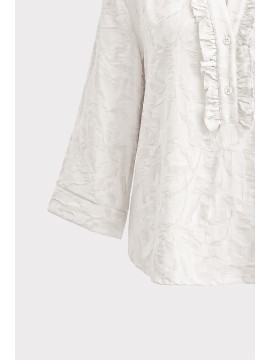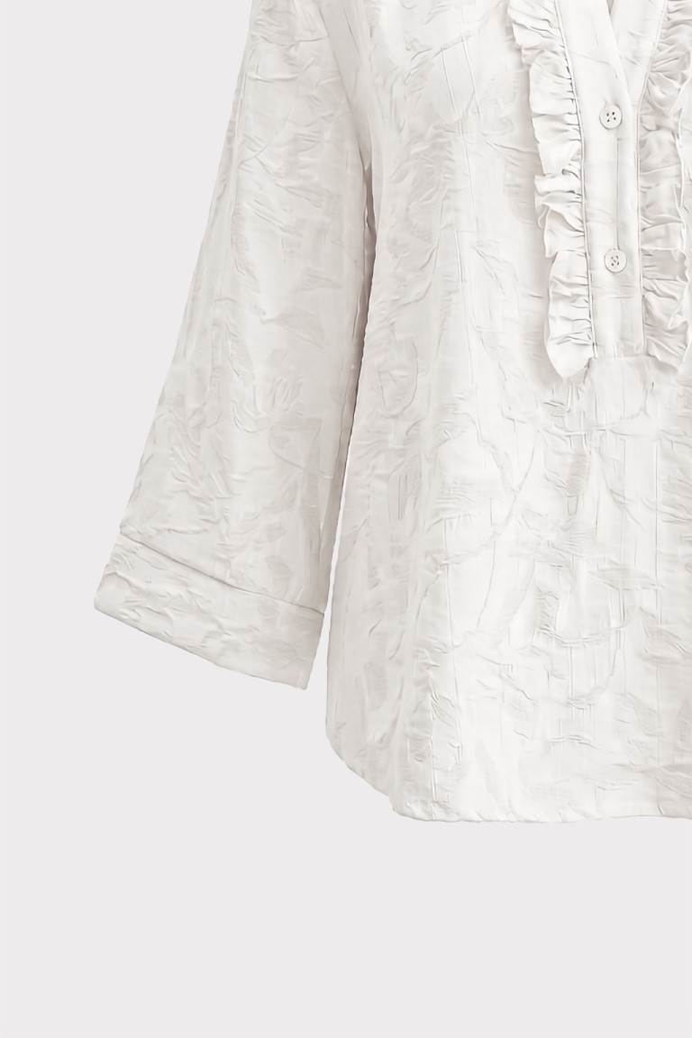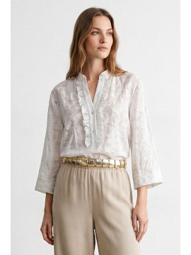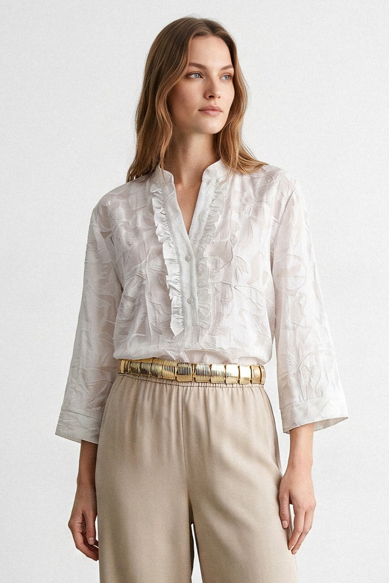 Blusa dallo stile raffinato e femminile, realizzata in tessuto misto viscosa leggero e fluido, ideale per garantire comfort e una vestibilità naturale. Il modello presenta uno scollo a V con apertura frontale e delicato dettaglio rouches che valorizza il décolleté, aggiungendo movimento e ricercatezza al capo. Le maniche a tre quarti con risvolto completano il design, rendendo la blusa pratica e versatile