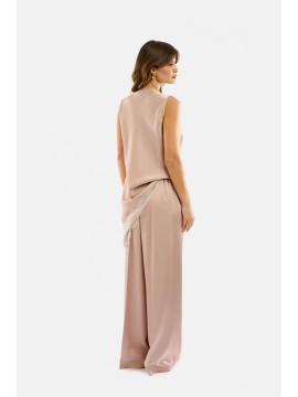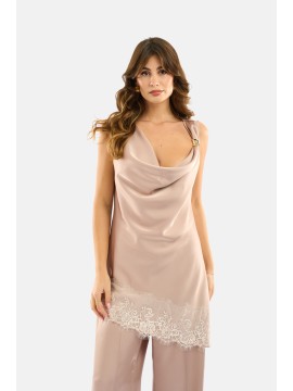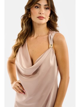 Blusa smanicata in raso dal drappeggio morbido sul davanti, con elegante scollo a cascata che illumina naturalmente il décolleté. La linea cade fluida e leggermente asimmetrica sul fondo, rifinita da un delicato inserto in pizzo tono su tono che aggiunge un tocco femminile. Dettaglio gioiello sulla spalla per un accento sofisticato. Perfetta da sola o sotto blazer strutturati