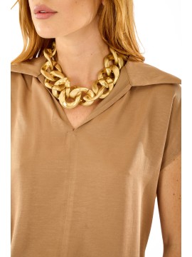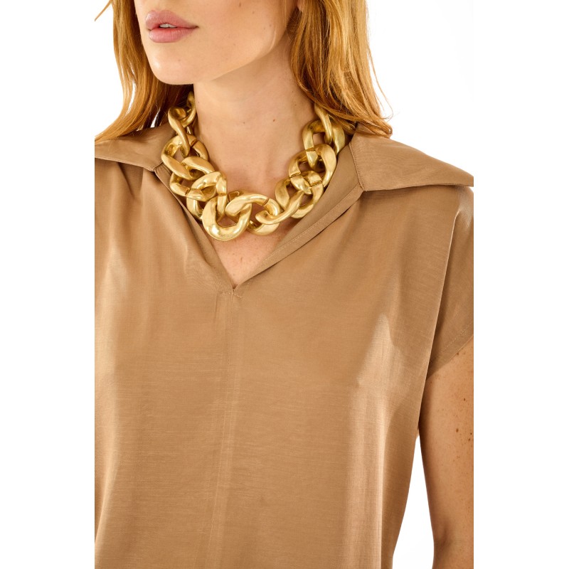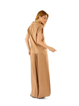 Blusa realizzata in raso con delicata texture leggermente increspata, presenta maniche a kimono, scollo a V e colletto classico. Il taglio morbido e fluido garantisce comfort ed eleganza, ideale da indossare con pantaloni sartoriali o gonne midi per look day-to-night.