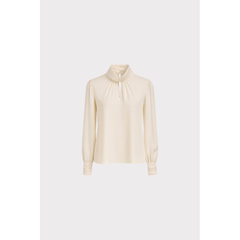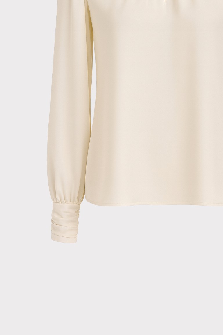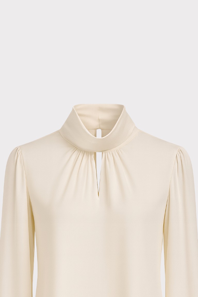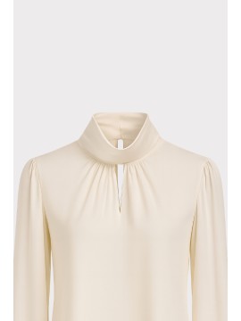 Blusa realizzata in tessuto fluido e luminoso, caratterizzata da un collo drappeggiato che avvolge delicatamente il collo con costruzione sartoriale pulita e minimalista. Il dettaglio del collo alto, morbido e raffinato, regala un fascino discreto ma deciso, perfetto per un look sofisticato da giorno o da sera.Le spalle leggermente arricciate e i polsini strutturati conferiscono un equilibrio tra rigore e morbidezza. Leleganza essenziale di questo modello ne fa un capo chiave del guardaroba contemporaneo: perfetto sotto blazer maschili o portato con denim dal taglio dritto per un contrasto raffinato. Ideale per valorizzare una femminilità discreta ma consapevole