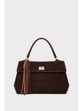 Borsa a mano in materiale combinato con effetto suede sul davanti. Dotata di chiusura con girello dorato è impreziosita da nappine decorative laterali e da tasche porta oggetti sul retro per essere una borsa senza tempo, ideale per uno stile sofisticato sia di giorno che di sera. Presenta scomparti interni e tracolla removibile. cm 33x24x11