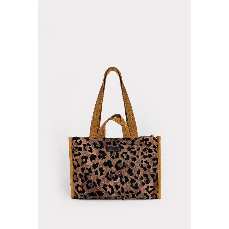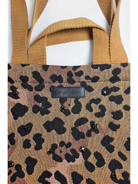 Borsa in tessuto jacquard maculato. Manici corti e lunghi per spalla. Interno foderato con tasca porta oggetti. Chiusura con bottone nascosto. Dettaglio di pietre nere sul davanti. Dimensioni:altezza cm 26, lunghezza cm 38, profondità cm 10.