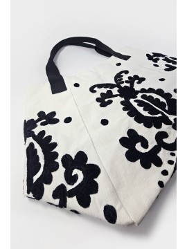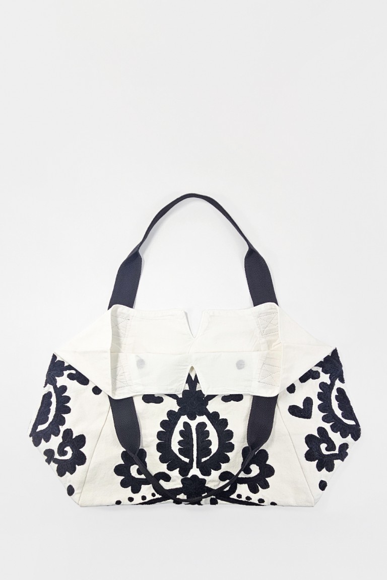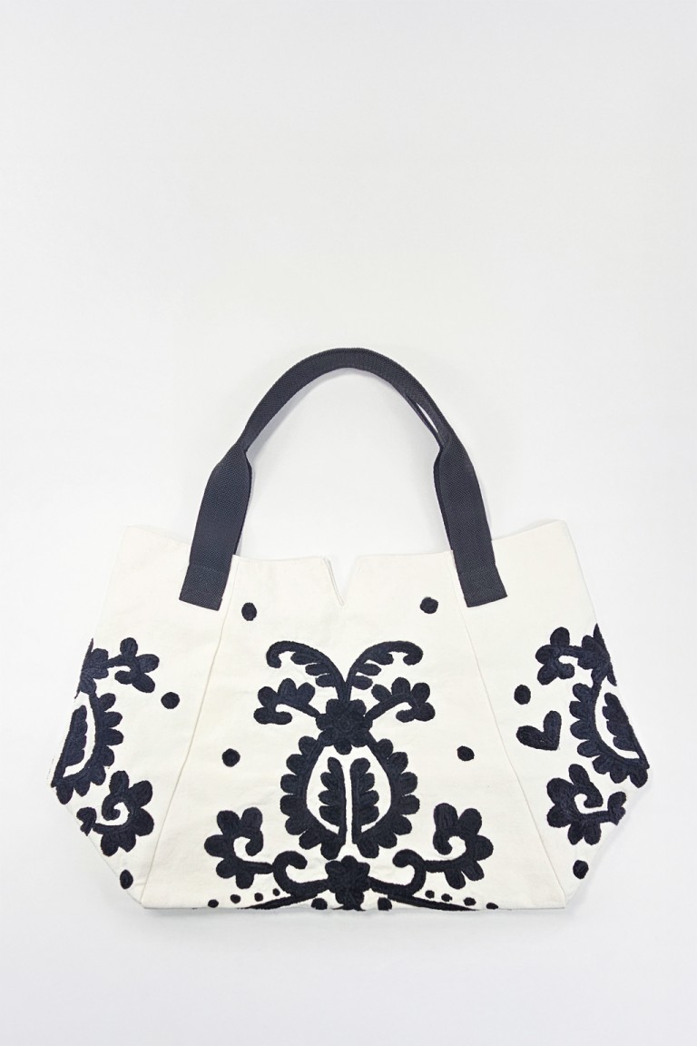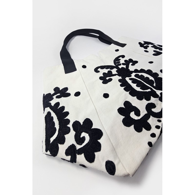 Borsa in cotone con ricamo a contasto. Manici a spalla in nastro nero. Interno foderato con taschino porta oggetti. Dimensioni: altezza cm 36 , lunghezza cm 40, profondità cm 23.