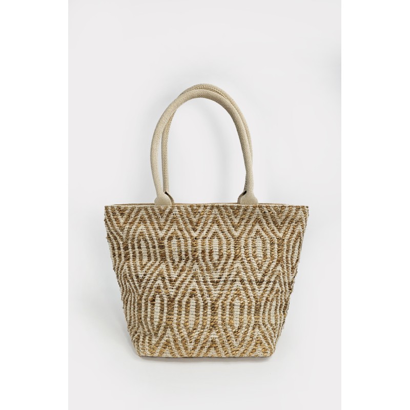 Borsa in juta e cotone con disegno losanghe sul davanti. Interno foderato con tasca porta oggetti. Chiusura centrale con cerniera. Manici a spalla. Dimensioni: altezza cm 35, lunghezza superiore cm 49, lunghezza inferiore cm 28, profondità cm 28.