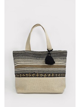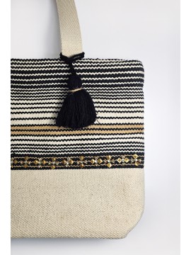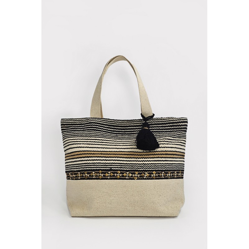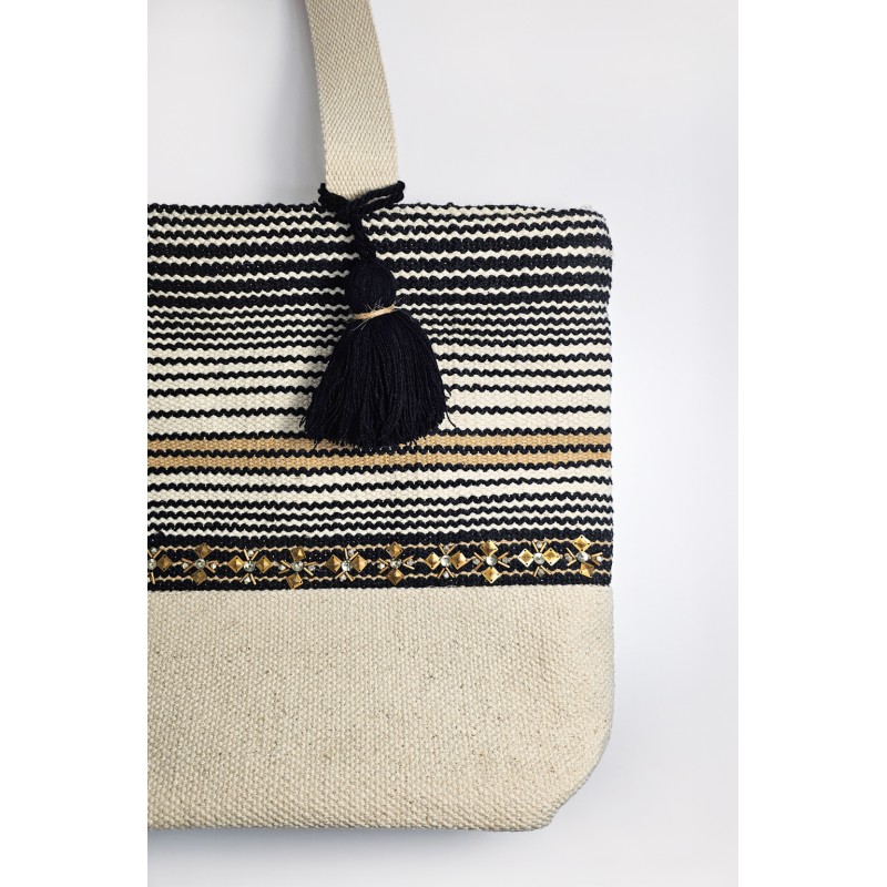 Borsa in cotone con disegno a righe. Dettaglio di ricamo con paillettes metalliche e pendente in cotone nero. Interno foderato con tasca porta oggetti. Chiusura centrale con cerniera. Manici a spalla. Dimensioni: altezza cm 36,5, lunghezza superiore cm 50, lunghezza inferiore cm 39, profondità cm 13.