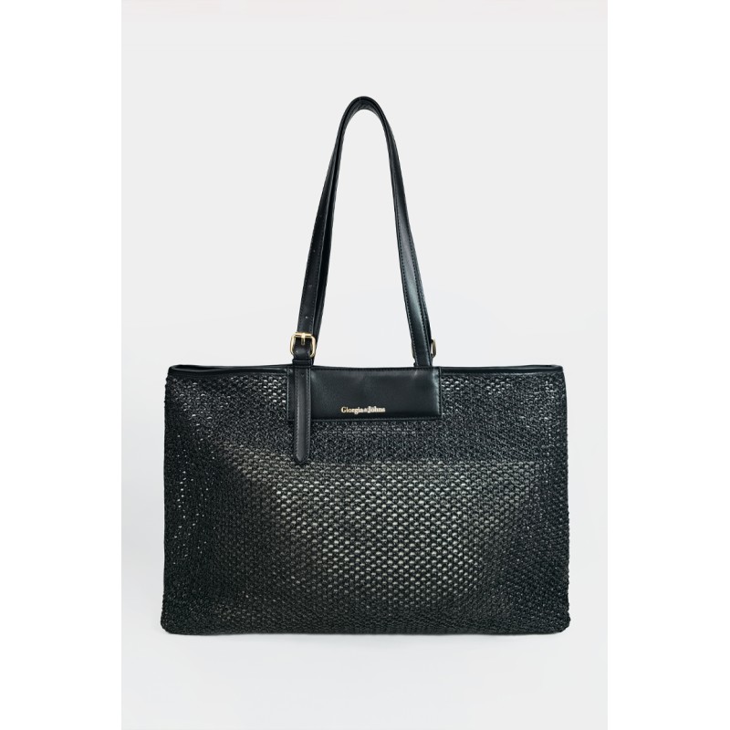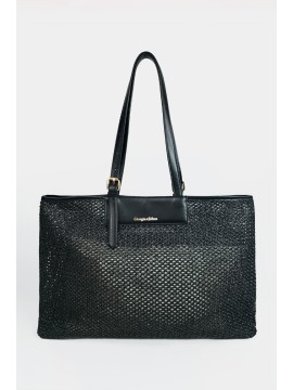 Shopping bag a spalla in materiale effetto paglia e riporti in similpelle. Manici regolabili con fibbie metalliche. Sacca interna in canvas con tasche portaoggetti.Altezza x Larghezza x Spessore 32 x 46 x 13cm.