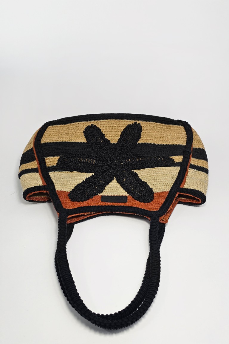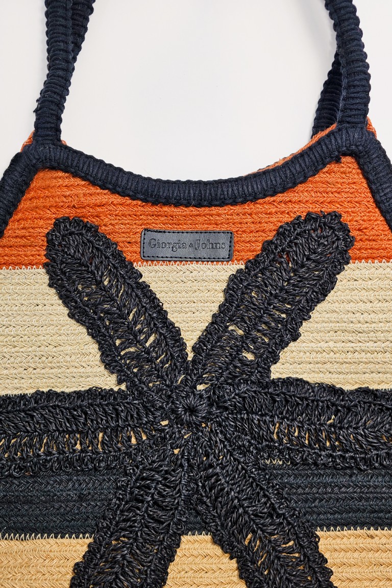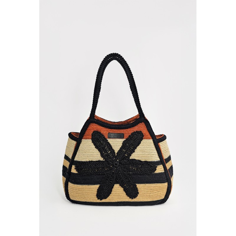 Borsa a spalla in juta a righe. Dettaglio di fiore in rafia. Interno sfoderato. Dimensioni: altezza cm 32, lunghezza cm 44, profondità cm 14.
