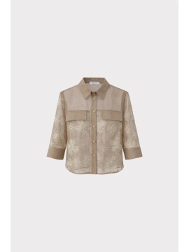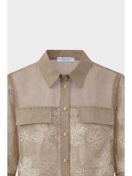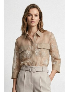 Un capo che unisce delicatezza e struttura in un equilibrio sofisticato. Questa camicia è realizzata in tessuto leggermente velato effetto organza, che dona luminosità e leggerezza alla silhouette.Il vero protagonista è il ricamo floreale tono su tono all over, realizzato con filo in rilievo che crea profondità e movimento. I fiori ricamati non sono semplici decorazioni, ma diventano parte integrante della texture del capo, conferendo un’estetica raffinata e contemporanea. Il design è completato da colletto classico strutturato, abbottonatura frontale con bottoni tono su tono, pattine applicate sul petto, che aggiungono un tocco utility chic, maniche lunghe con polsino alto, per una linea più elegante. La vestibilità è morbida ma definita.