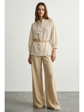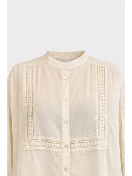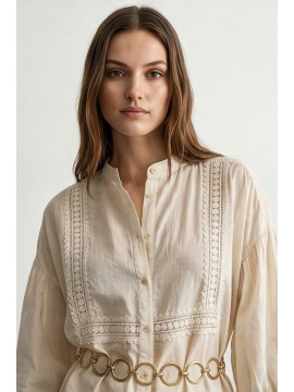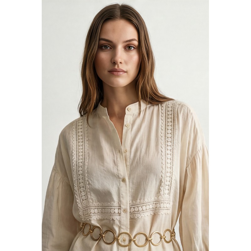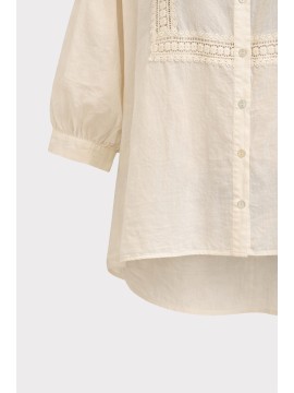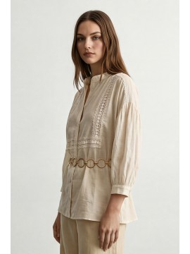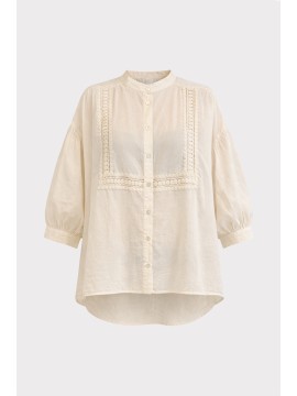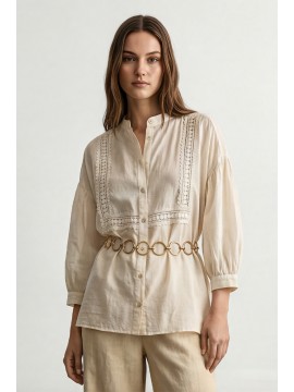 Camicia in cotone leggero e traspirante, caratterizzata da una linea morbida e femminile. Il design è valorizzato da eleganti inserti in passamaneria applicati sul davanti, che creano un raffinato gioco di texture e donano al capo un’allure romantica e contemporanea. Lo scollo a V con abbottonatura frontale slancia la figura, mentre le maniche 3/4 aggiungono praticità e versatilità, rendendo la camicia perfetta per la stagione primavera estate. Il fit fluido e il tessuto naturale assicurano comfort e freschezza durante tutta la giornata, ideale per look casual chic curati e senza tempo.