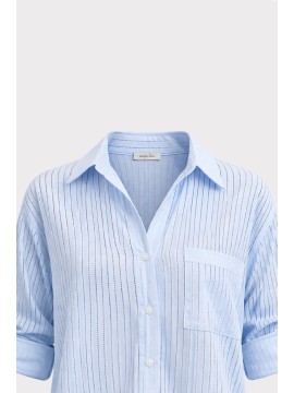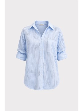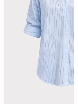 Camicia rigata dallo stile fresco e contemporaneo.Il modello si distingue per il tessuto leggero e leggermente trasparente con texture a righe verticali, che slancia la figura e dona un effetto visivo raffinato e moderno. La vestibilità morbida e oversize garantisce massimo comfort e libertà di movimento, rendendola ideale per look casual chic.