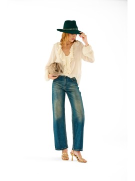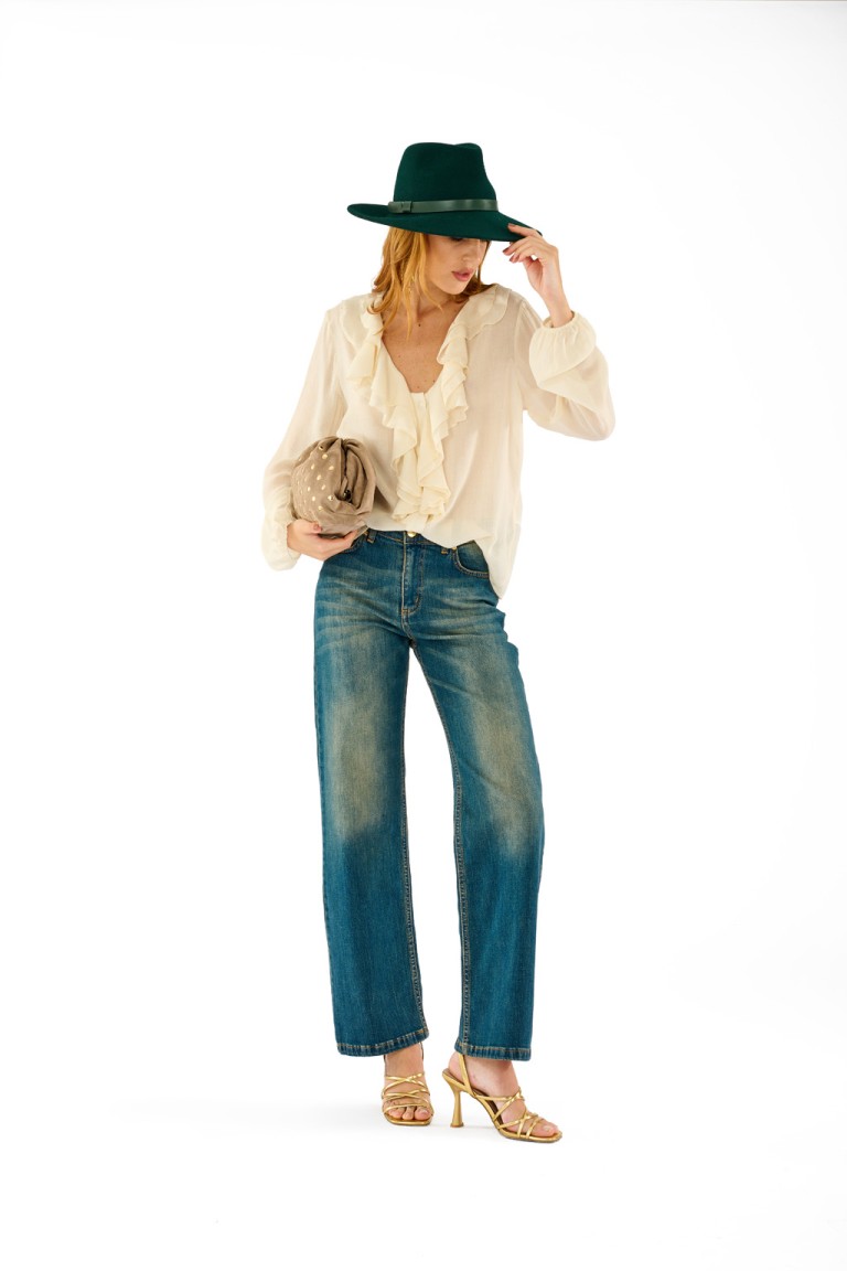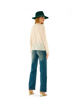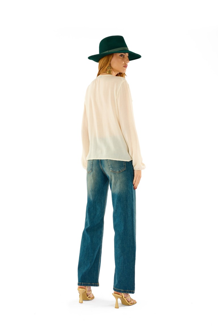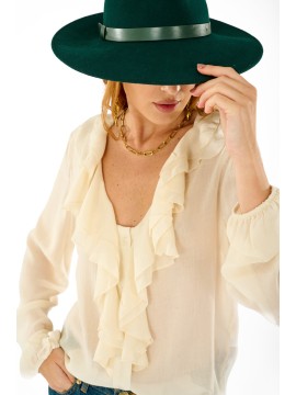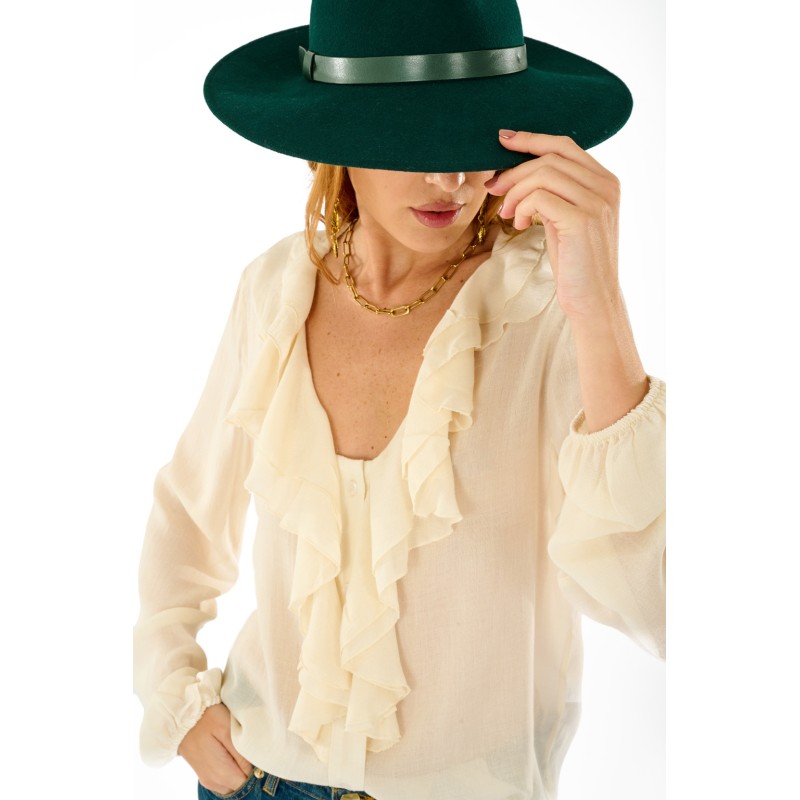 Camicia realizzata in garza leggera, presenta un elegante scollo a V arricchito da morbide balze frontali. Le maniche lunghe con polsino e la linea morbida donano comfort e femminilità. Perfetta da abbinare a pantaloni a vita alta o gonne per look da ufficio o tempo libero con un tocco boho-chic