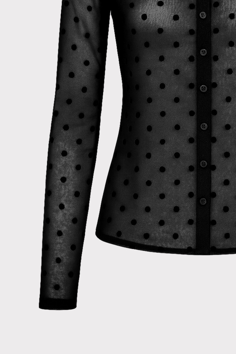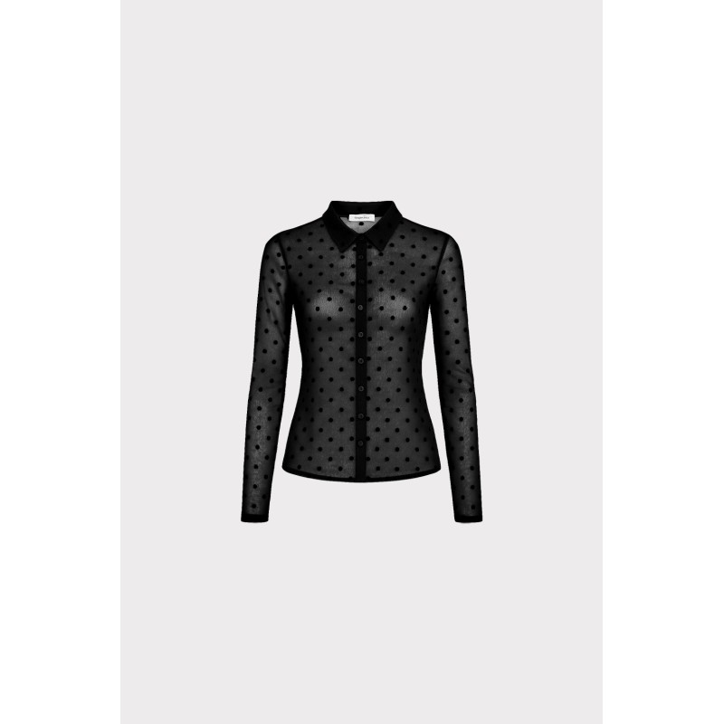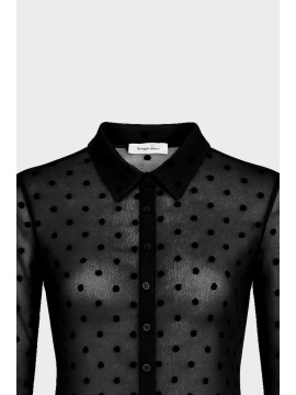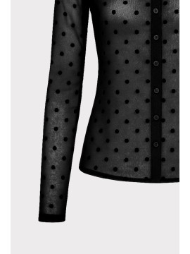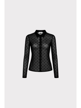 Camicia in tulle leggero con pois floccato dal fascino trasparente e contemporaneo. Modello con colletto classico, abbottonatura frontale e maniche lunghe con polsino. Linea dritta e vestibilità regolare, perfetta da indossare su top o lingerie coordinata per un effetto sofisticato e moderno.