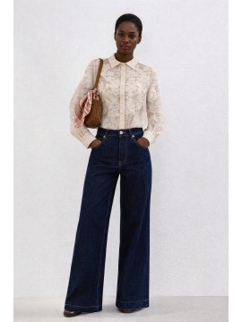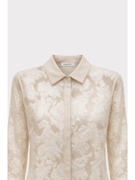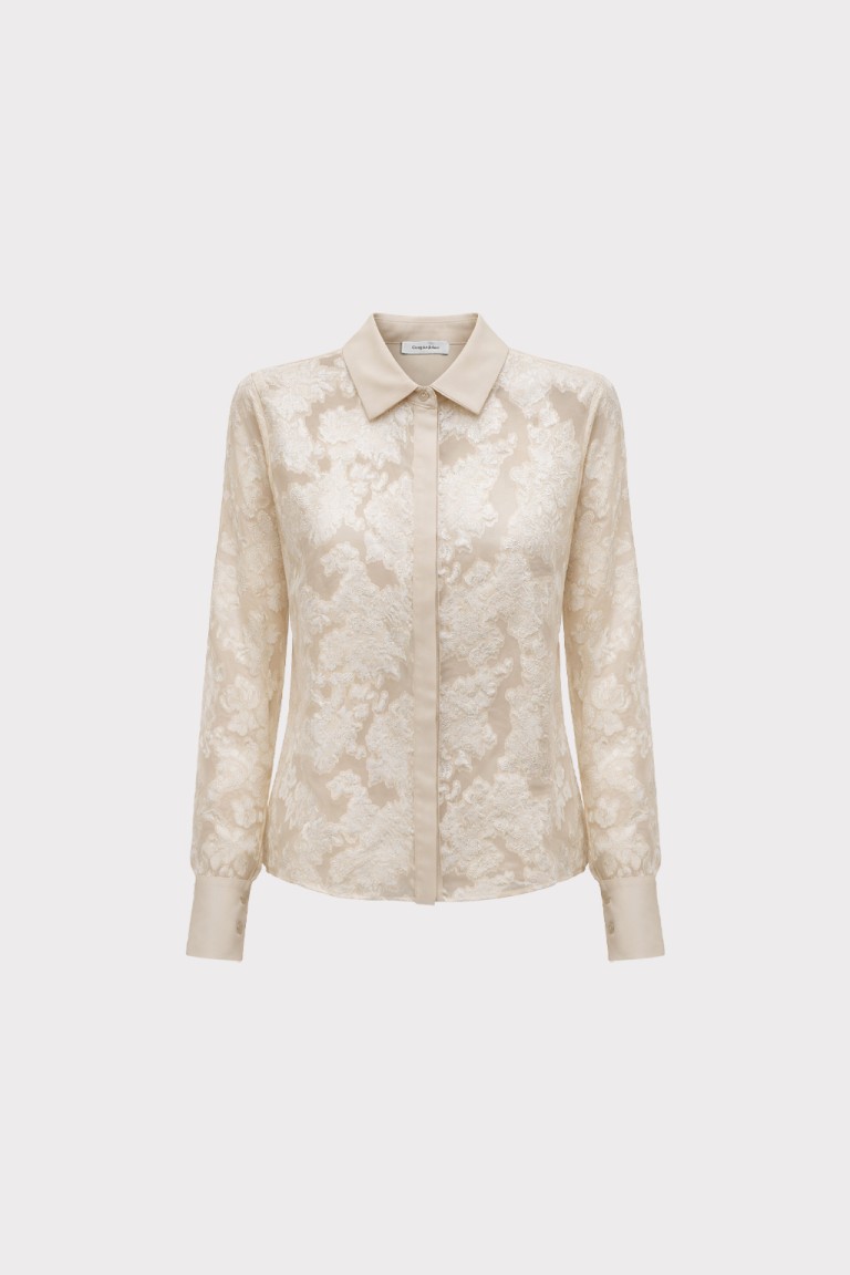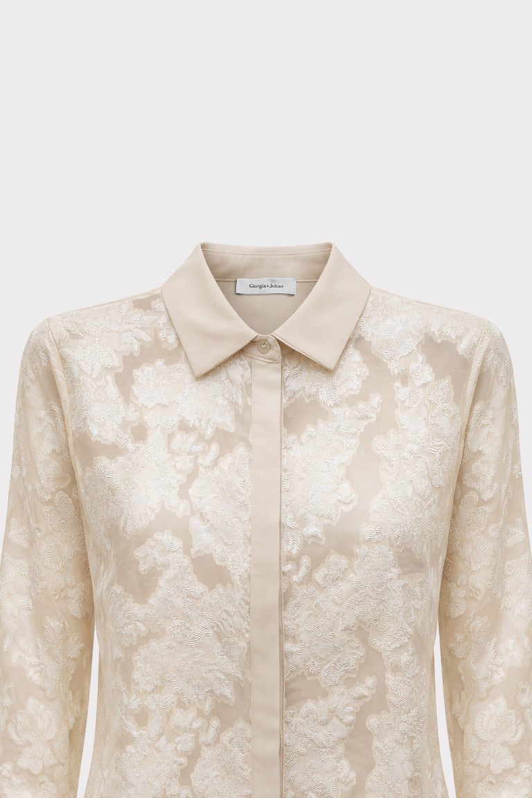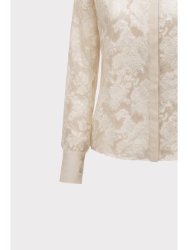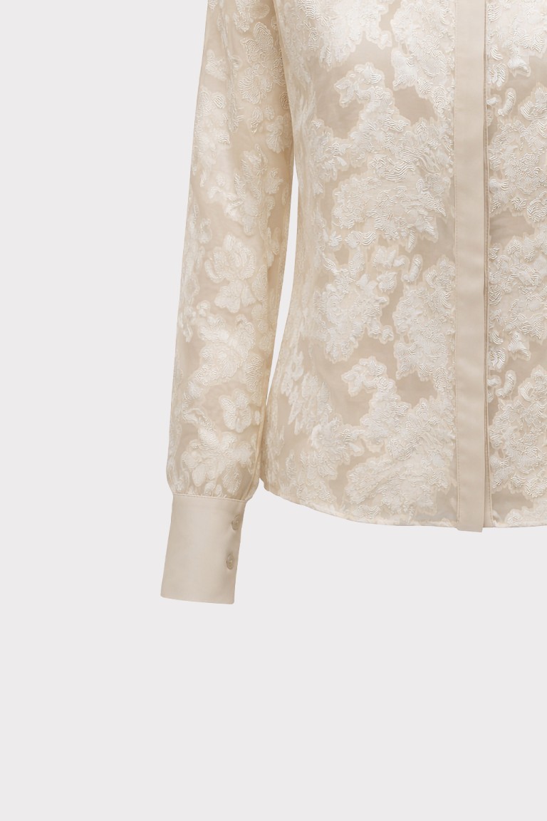 Camicia in tessuto leggero trasparente con lavorazione floreale in rilievo. Il colletto classico e i polsini con bottoni ricoperti donano un’eleganza sartoriale. Perfetta da indossare sopra top coordinati o con gonne e pantaloni a vita alta per un look sofisticato.