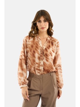 Camicia in georgette stampata animalier astratto, leggera e fluida, ideale per look raffinati ma contemporanei. Il modello presenta scollo a V con bottoncini frontali, maniche lunghe con polsino e linea morbida che dona movimento. La stampa nei toni caldi enfatizza l’eleganza del tessuto e rende la camicia perfetta da abbinare sia a pantaloni tailoring che a denim. Un capo versatile che valorizza ogni outfit grazie alla sua texture impalpabile.