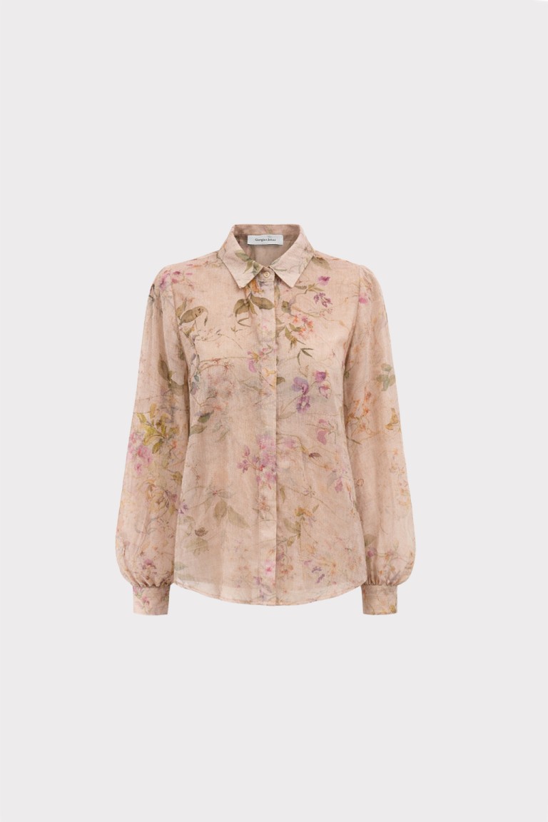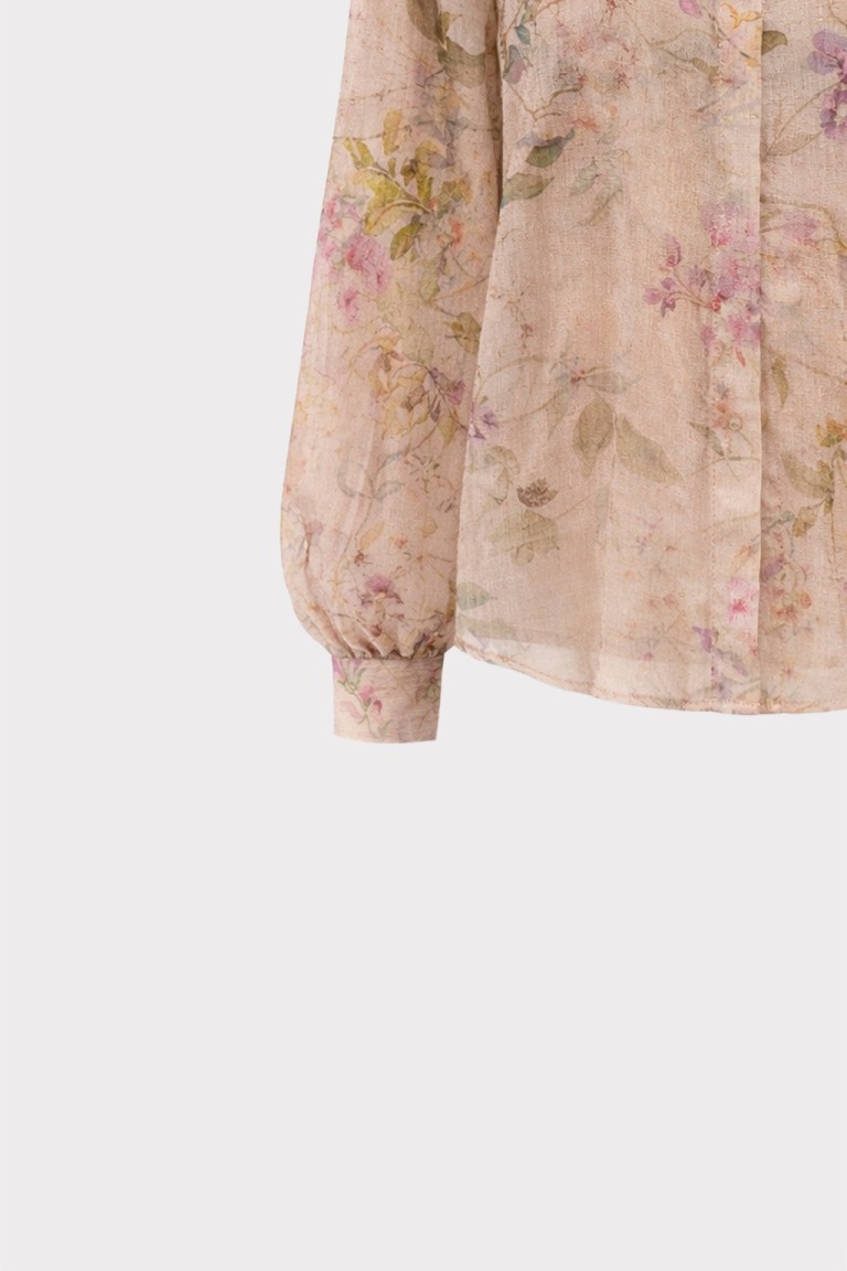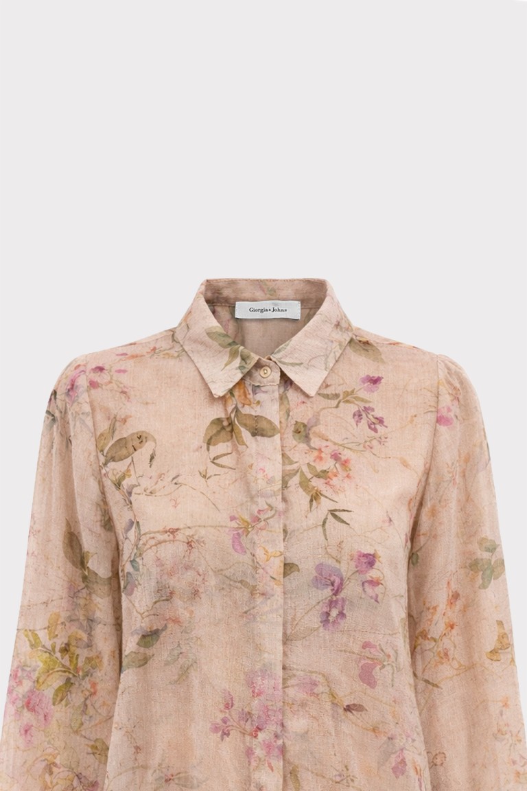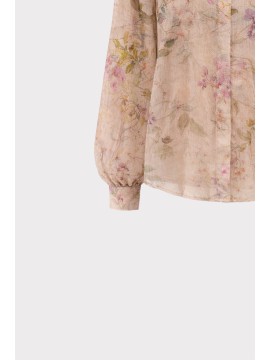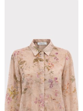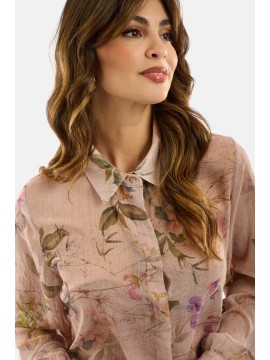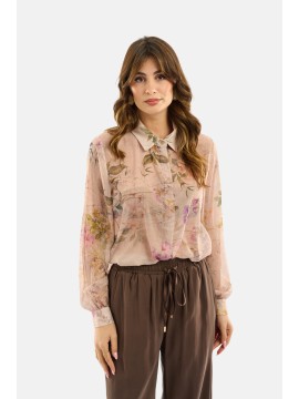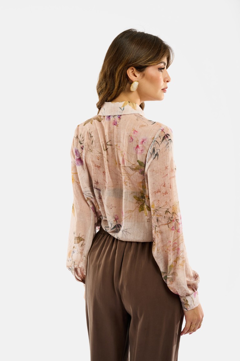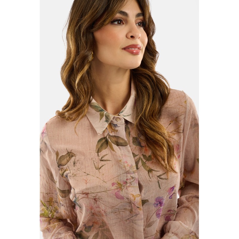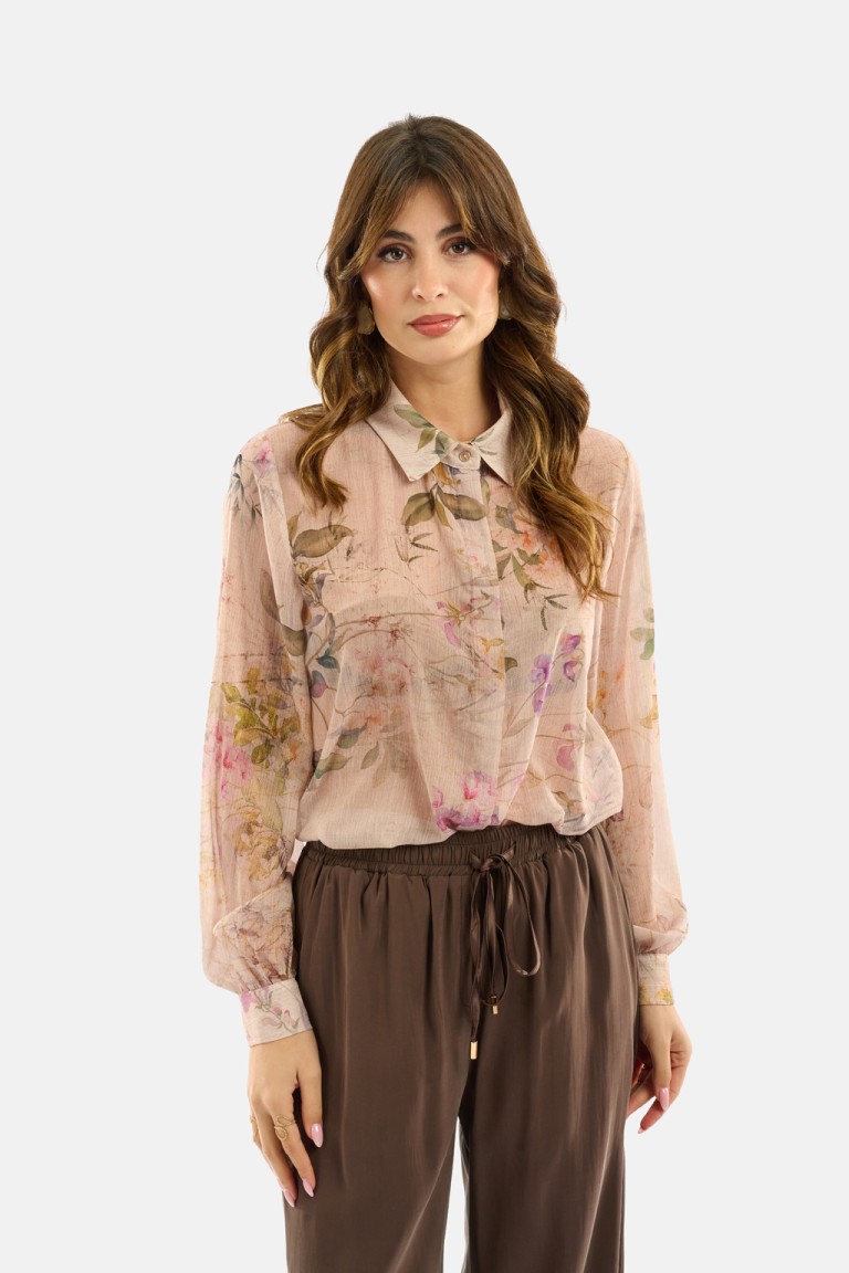 Camicia in tessuto leggero con stampa floreale effetto acquerello, caratterizzata da un design fluido e trasparente che dona un’eleganza naturale. Il colletto classico e i polsini con bottone completano il modello con un tocco di raffinatezza. Perfetta da indossare su top in coordinato o sotto blazer leggeri, per look romantici e contemporanei.