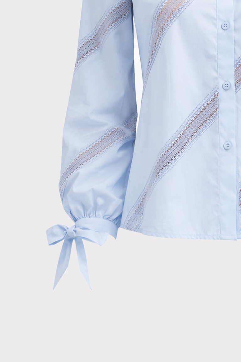 Camicia in cotone con colletto. Maniche lunghe con dettaglio di polsino annodabile al fondo. Chiusura frontale con bottoni in tono. La modella è alta 1,75 cm ed indossa una taglia S.