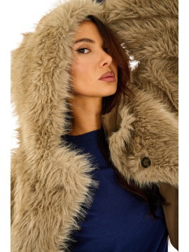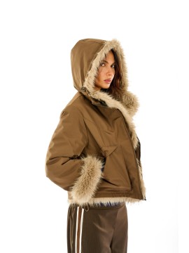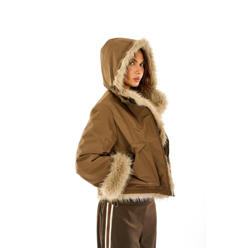 Giacca corta reversibile con esterno in nylon e interno in morbida eco pelliccia , ideale per affrontare la stagione fredda con stile. Dotata di cappuccio e dettagli che rendono il capo grintoso, unisce comfort e tendenza. Perfetta per look casual chic e abbinamenti con jeans o gonne invernali.
