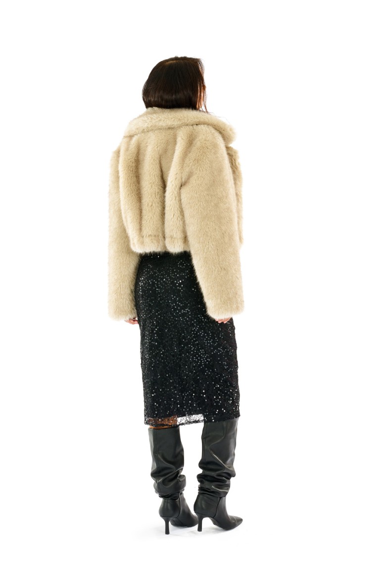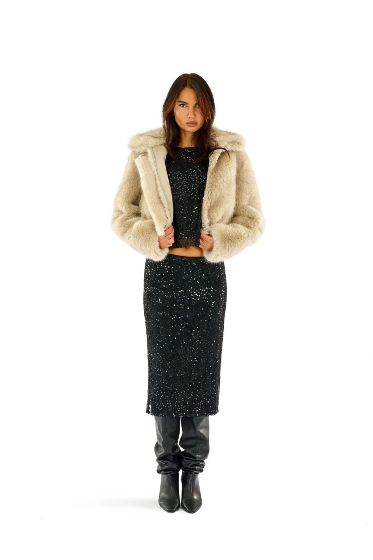 Giacca modello bomber in eco pelliccia con collo oversize e chiusura invisibile. Calda, avvolgente e dal design sofisticato, è il capo must-have per affrontare l'inverno con stile. Perfetta da abbinare a gonne, pantaloni o abiti per un look glamour, elegante e al passo con le tendenze moda.