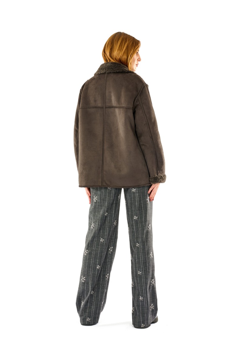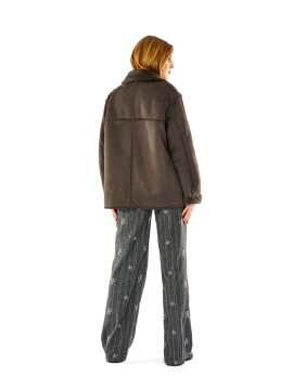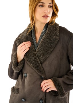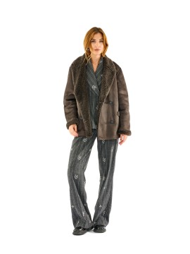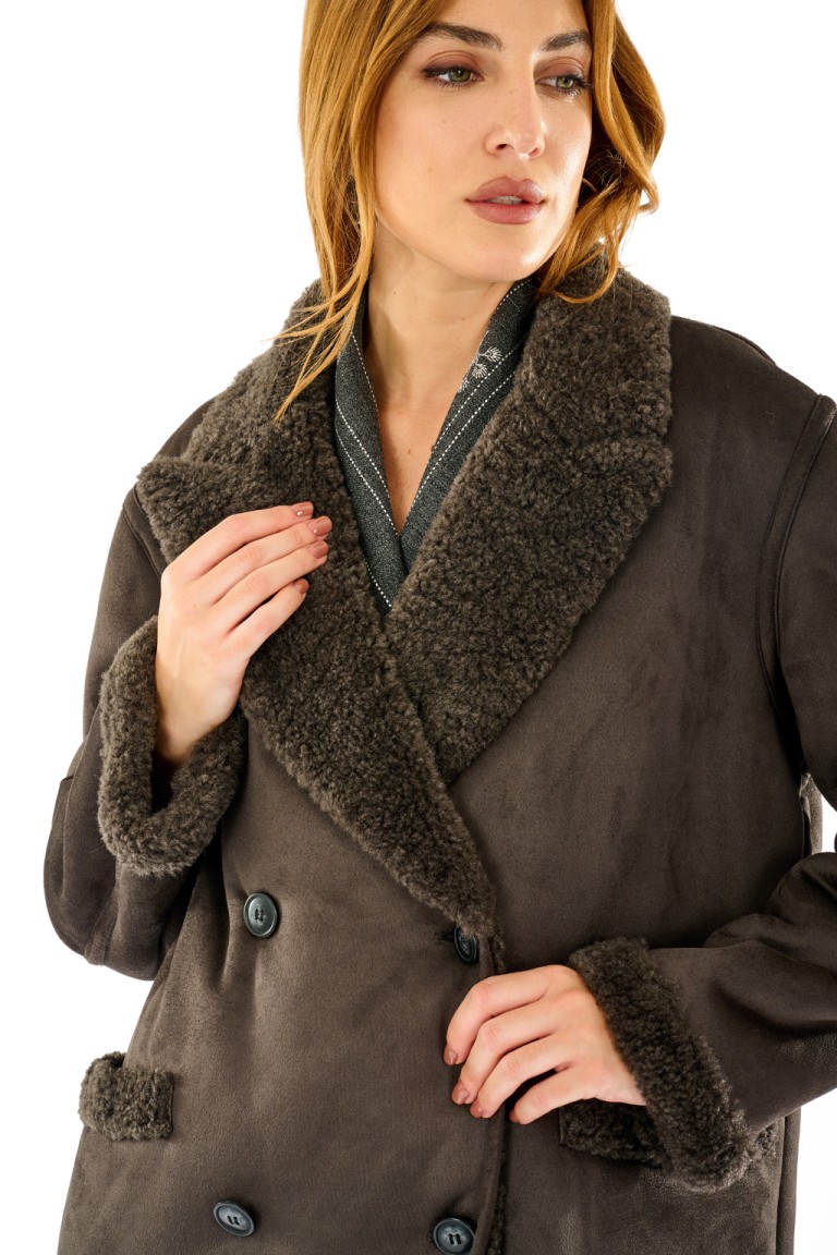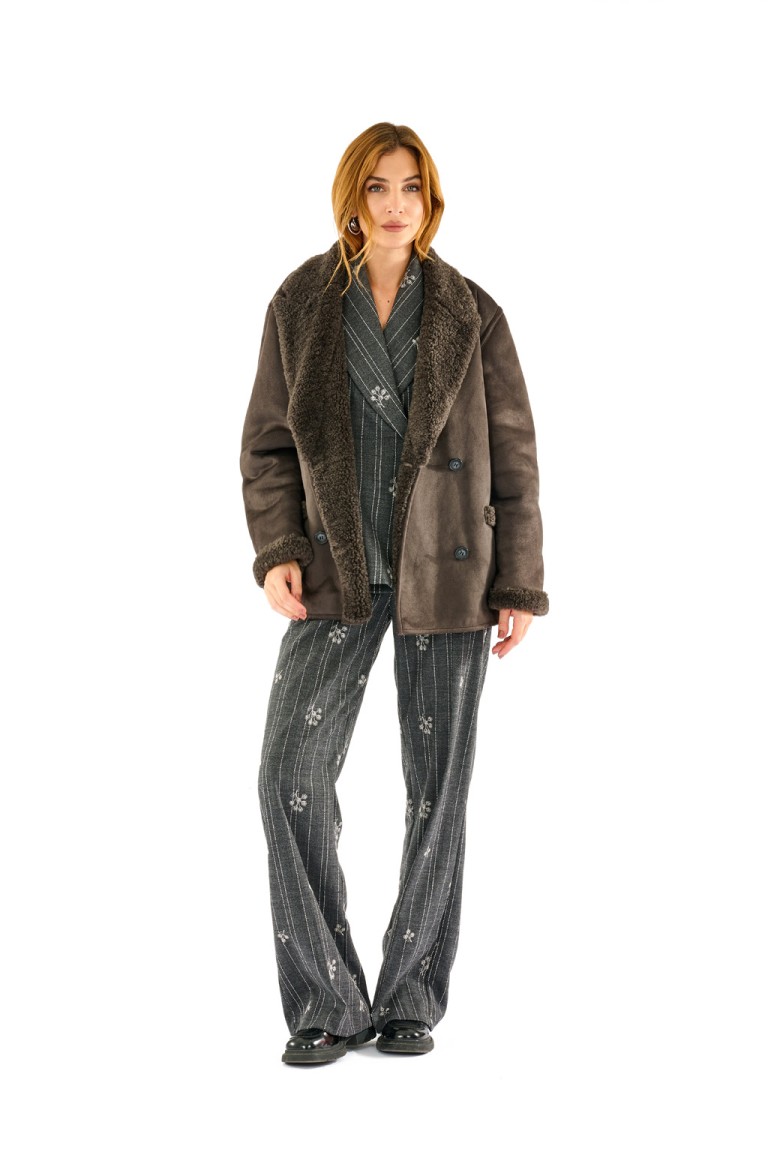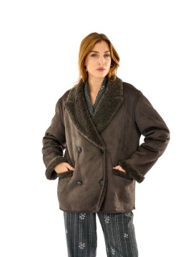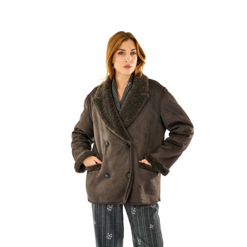 Giacca corta effetto montone con interno e dettagli in eco pelliccia. Doppio petto, ampi revers e vestibilità morbida per un look casual e ricercato. Ideale per la stagione fredda, unisce comfort e stile urbano