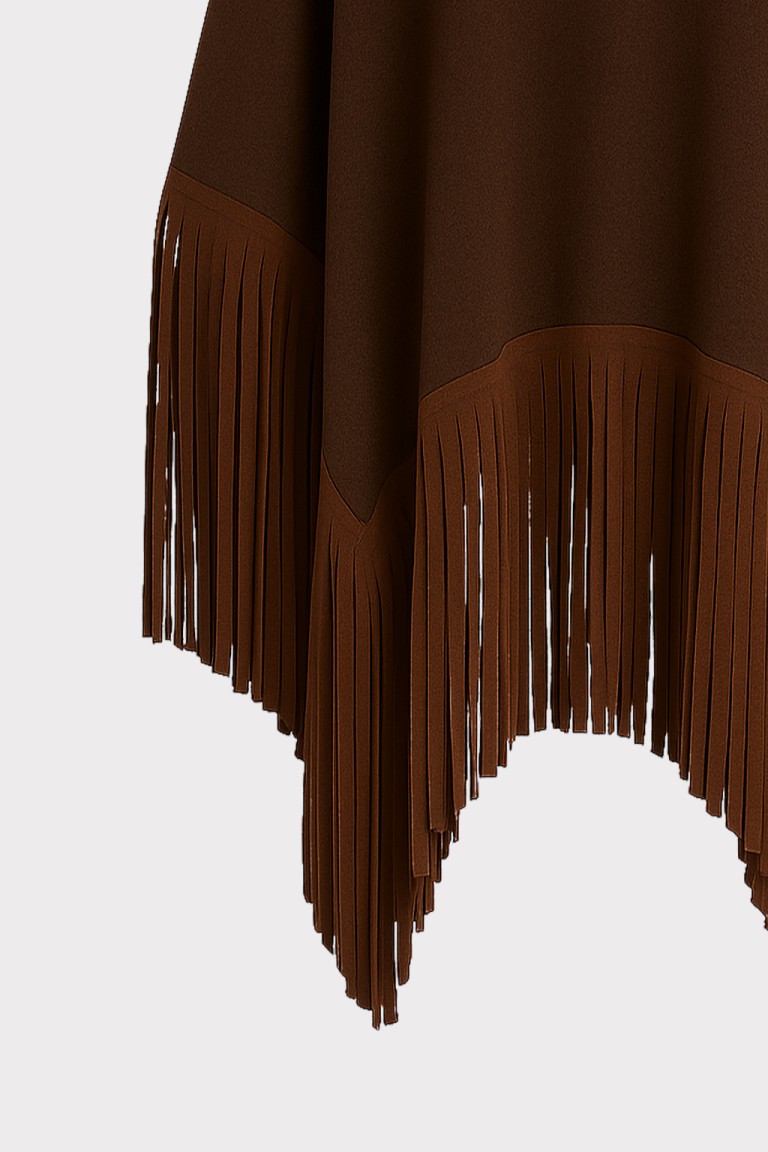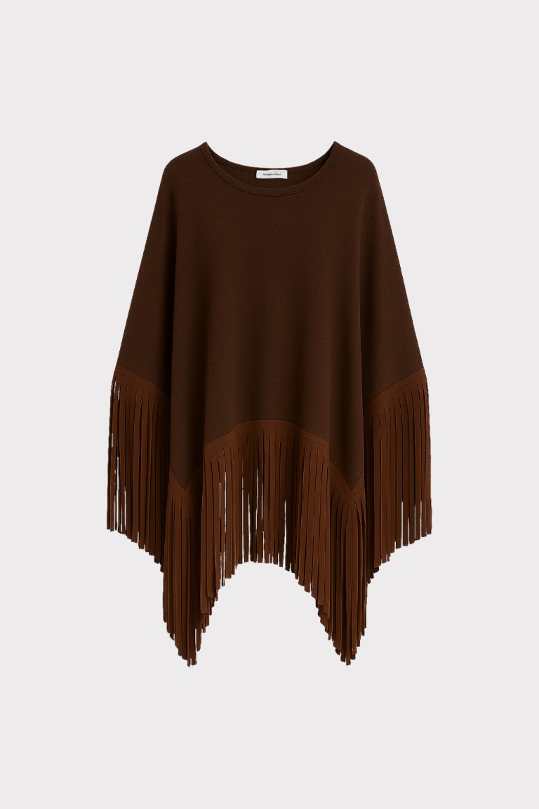 Poncho con frange in stile boho chic, perfetto per la stagione autunno inverno. Realizzato in morbida maglia effetto cashmere, questo poncho presenta eleganti dettagli in tessuto scamosciato tono su tono su maniche e fondo, per un look sofisticato ma casual. La vestibilità ampia e il design senza tempo lo rendono ideale da indossare con pantaloni o jeans per un outfit trendy e confortevole. Capo versatile e caldo, pensato per la donna moderna che ama distinguersi con stile. Scopri il poncho con frange perfetto per le giornate più fredde.
