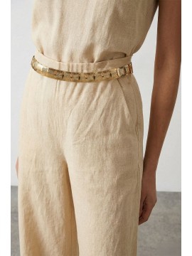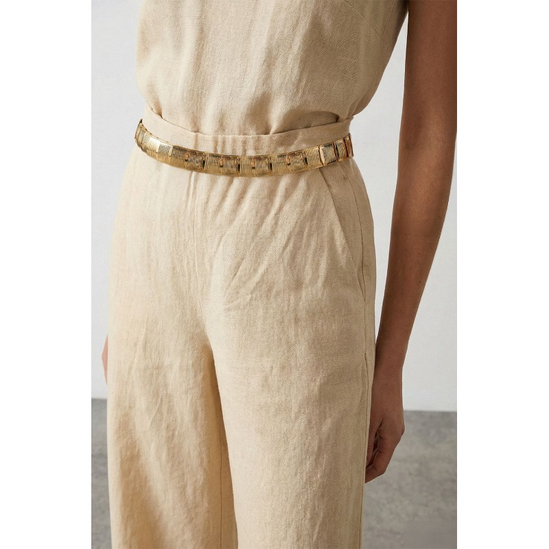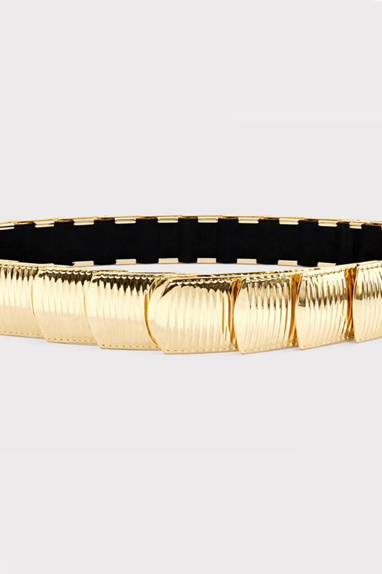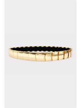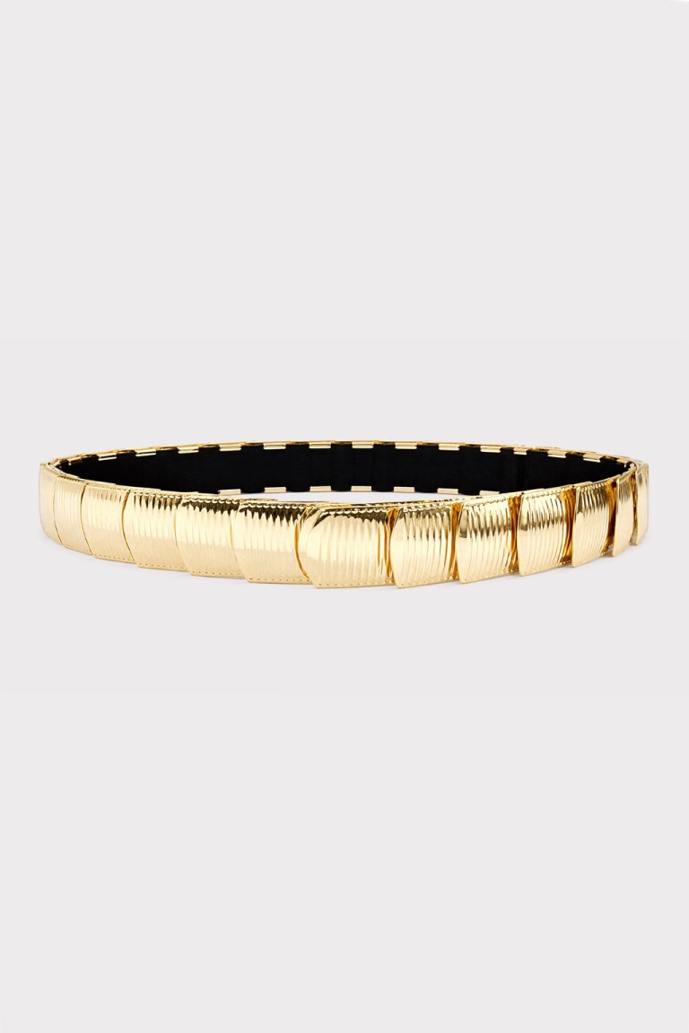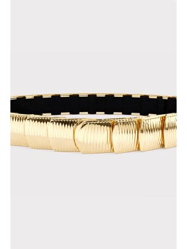 Cintura dal design deciso e contemporaneo, caratterizzata da una sequenza di placche metalliche dorate con lavorazione rigata che creano un effetto geometrico e strutturato di grande impatto visivo. La costruzione rigida valorizza il punto vita con precisione, mentre la finitura oro lucido dona luminosità e un’eleganza sofisticata. Un accessorio statement perfetto per elevare anche i look più essenziali