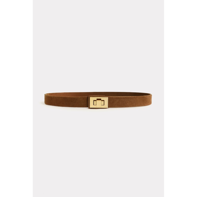 La cintura in suede morbido è arricchita da una chiusura gioiello a girello in metallo dorato, un dettaglio iconico e raffinato. Linea elegante, perfetta da indossare con abiti, camicie strutturate o pantaloni sartoriali. Un accessorio che dona immediatamente un tocco premium al look.