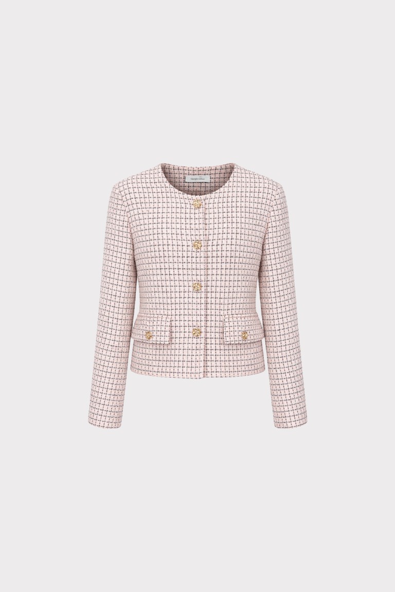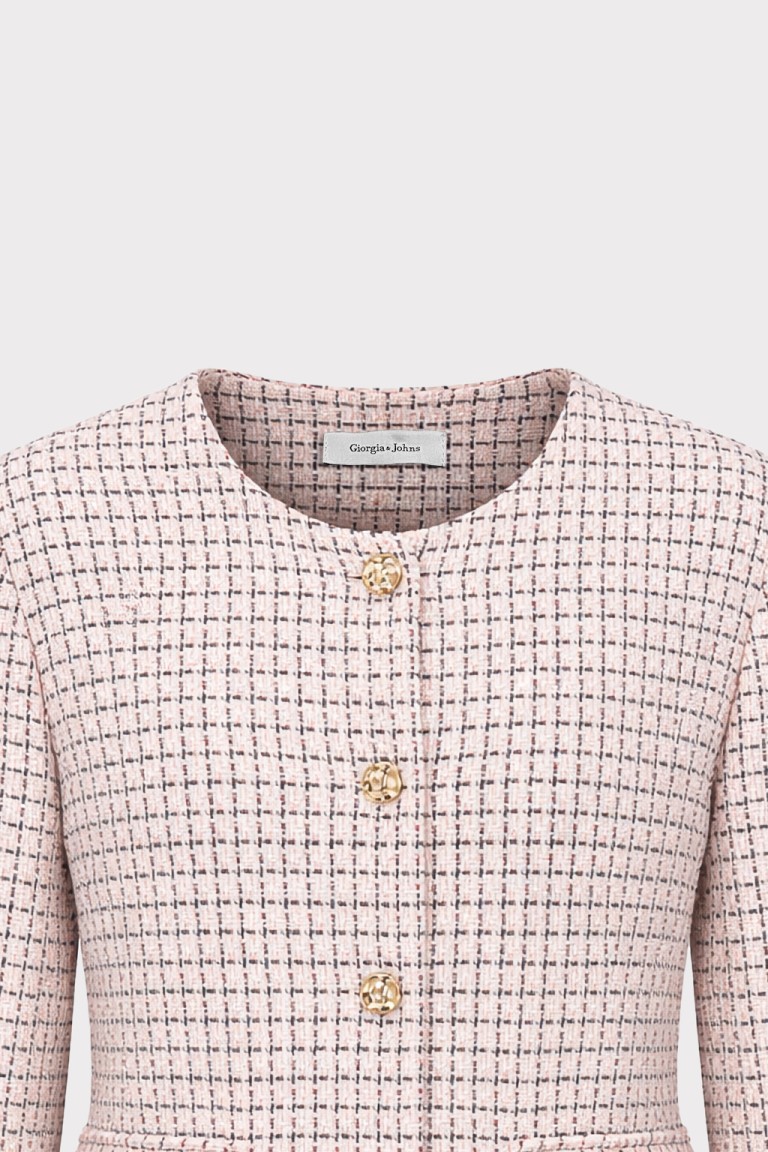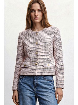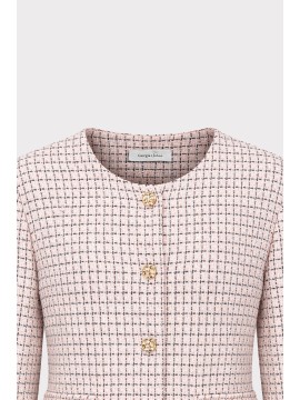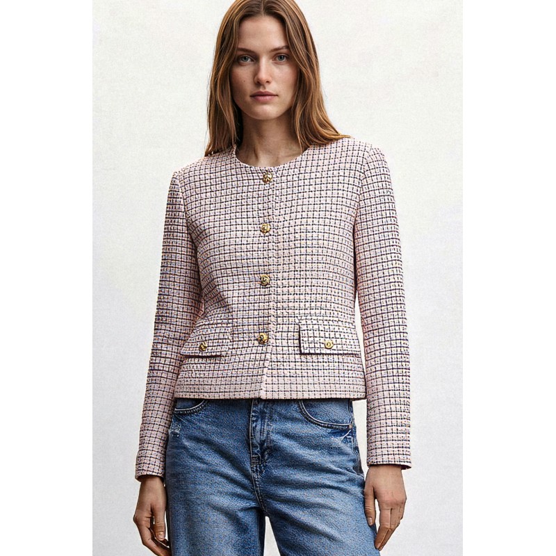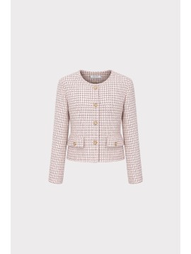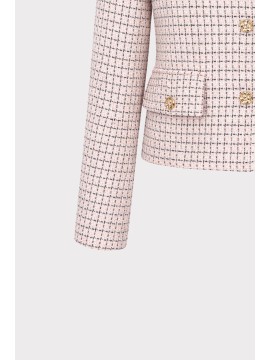Raffinata e contemporanea, questa giacca corta micro check combina eleganza sartoriale e modernità. Realizzata in tessuto bouclé con trama micro check, si distingue per la sua lavorazione strutturata che crea un effetto materico sofisticato e tridimensionale. Il modello presenta linea cropped e scollatura rotonda senza colletto, per un design pulito ed essenziale che valorizza la silhouette. La chiusura frontale con bottoni aggiunge un dettaglio elegante e distintivo, mentre le tasche applicate con pattina e bottone richiamano l’estetica delle giacche sartoriali.