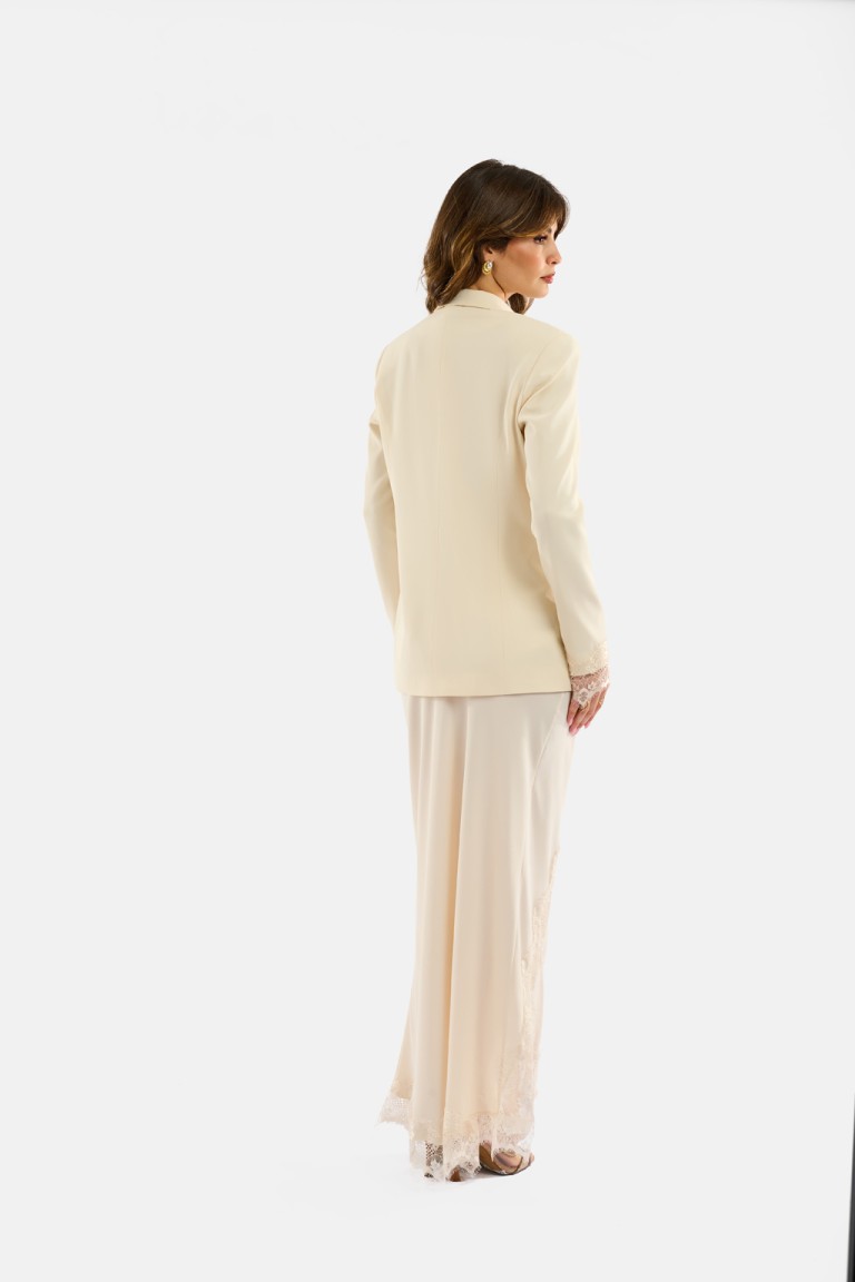 Blazer elegante con profili e inserti in pizzo ricamato sul rever, sul fondo e sui polsini. La linea sartoriale valorizza la silhouette con un unico bottone centrale e tasche frontali a pattina. Un capo sofisticato pensato per cerimonie, cocktail e occasioni speciali, perfetto anche come parte di un completo coordinato.