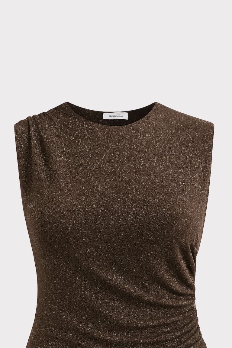 Top in tessuto lurex dalla texture luminosa e raffinata, perfetto per dare un tocco glamour a qualsiasi look. La linea morbida e leggermente drappeggiata valorizza la silhouette senza segnare, offrendo una vestibilità comoda e femminile. Le spalle strutturate e la lucentezza discreta del tessuto rendono questo top ideale sia per outfit da sera che per occasioni speciali. Abbinato a pantaloni eleganti o a una gonna midi, crea un look sofisticato e moderno