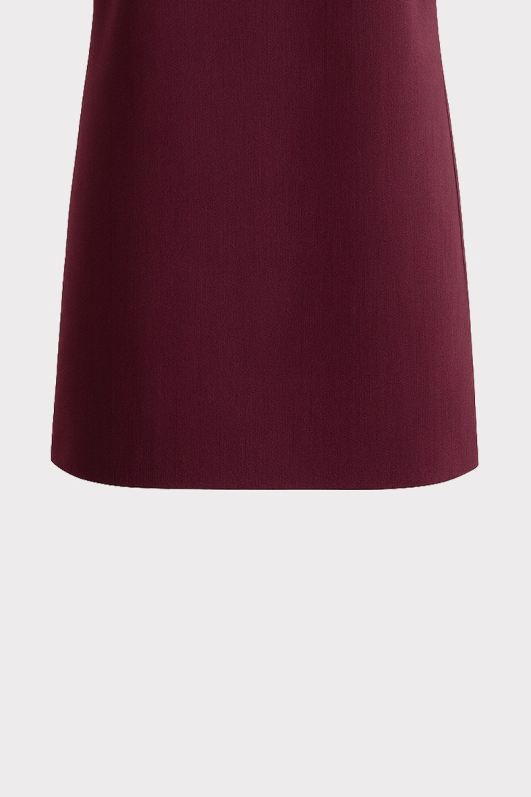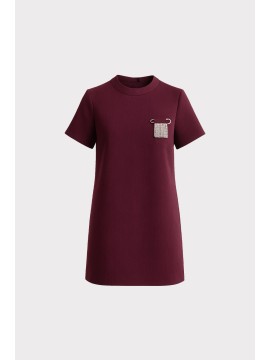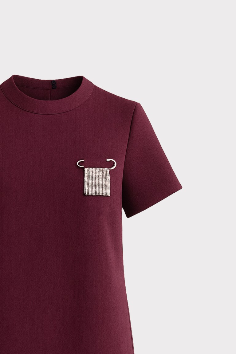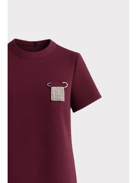 Abito corto in tessuto compatto dal taglio dritto e pulito, con manica corta e collo stondato. Il dettaglio gioiello della spilla con frange luminose dona un tocco contemporaneo al design minimal. Chiusura sul retro con bottoni rivestiti.