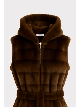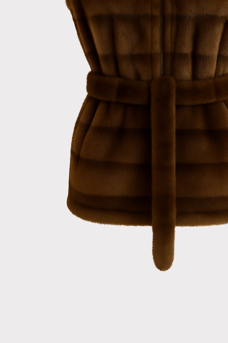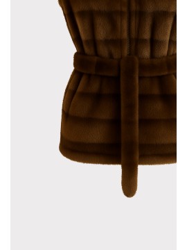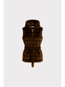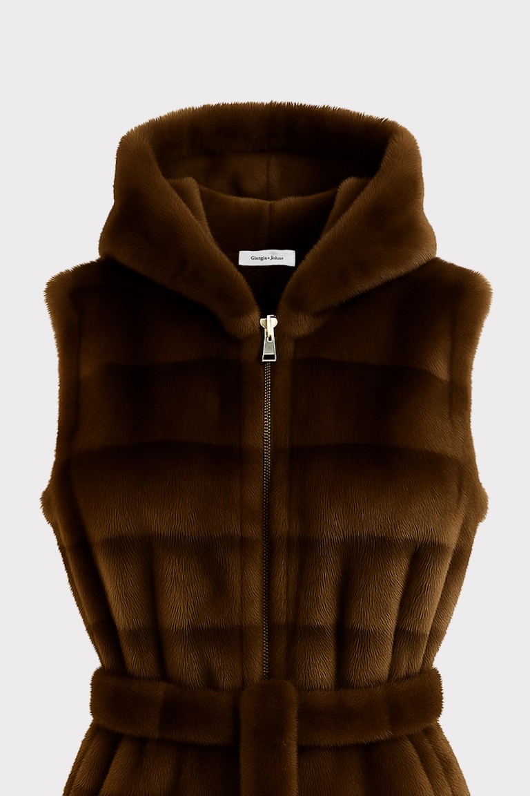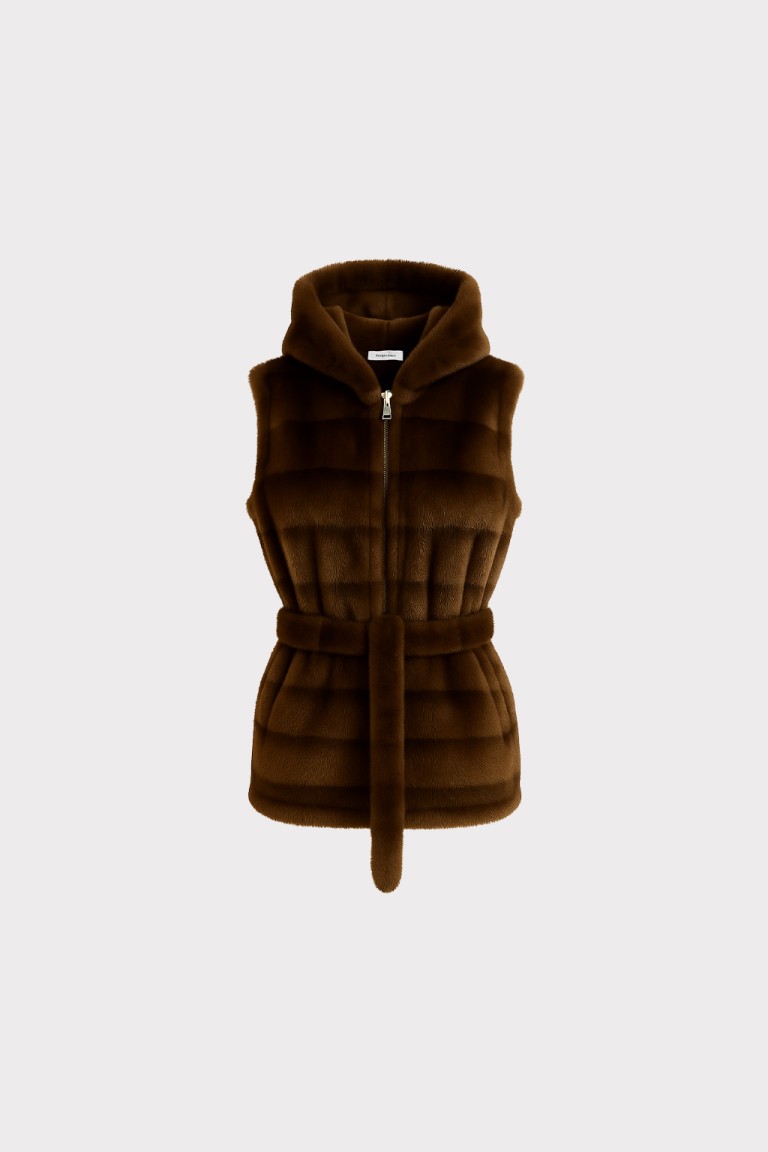 Elegante gilet donna in ecopelliccia con cappuccio, caratterizzato da un raffinato motivo a quadri tono su tono. Il modello dal design strutturato e sofisticato presenta una cintura in vita che valorizza la silhouette e dona un tocco femminile e sofisticato. Morbido e caldo, è perfetto da indossare sopra maglioni o camicie per completare look casual chic o eleganti outfit autunnali e invernali. Un capo versatile che unisce comfort, stile e sostenibilità