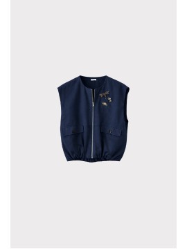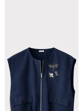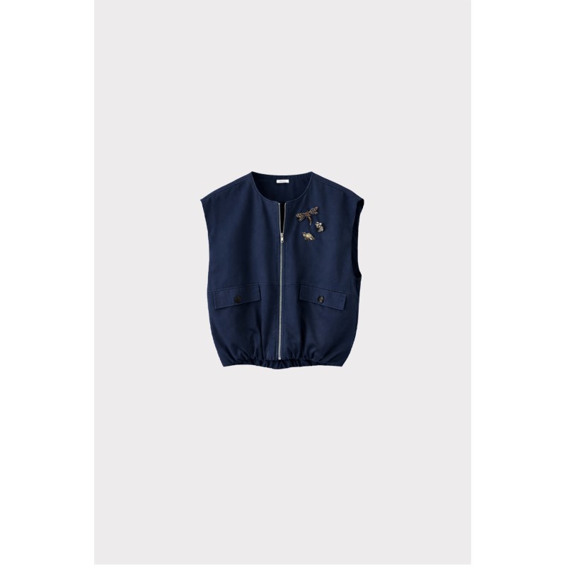 Gilet bomber in cotone compatto, con chiusura a zip dorata e tasche frontali con pattina. Il fondo elasticato e la linea leggermente voluminosa richiamano il classico bomber, reinterpretato in chiave femminile e sofisticata. Le spille gioiello rimovibili impreziosiscono il capo, perfetto da indossare sopra camicie o abiti per un look urbano e raffinato