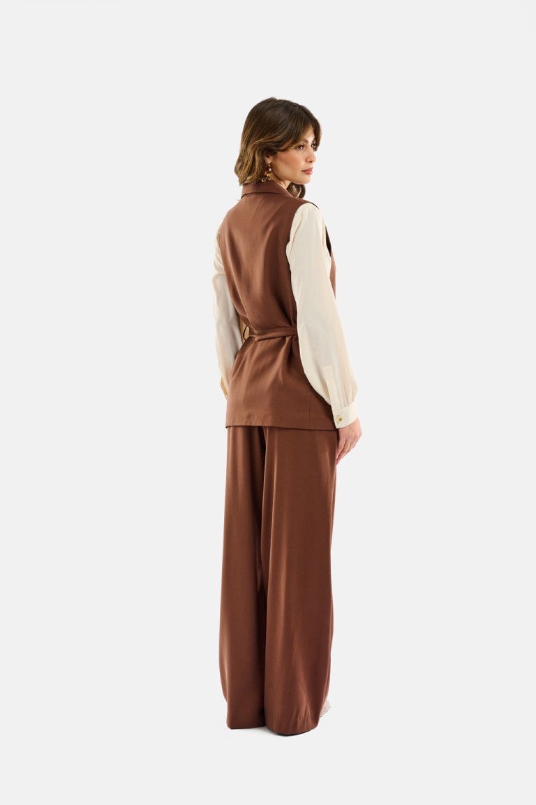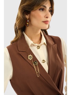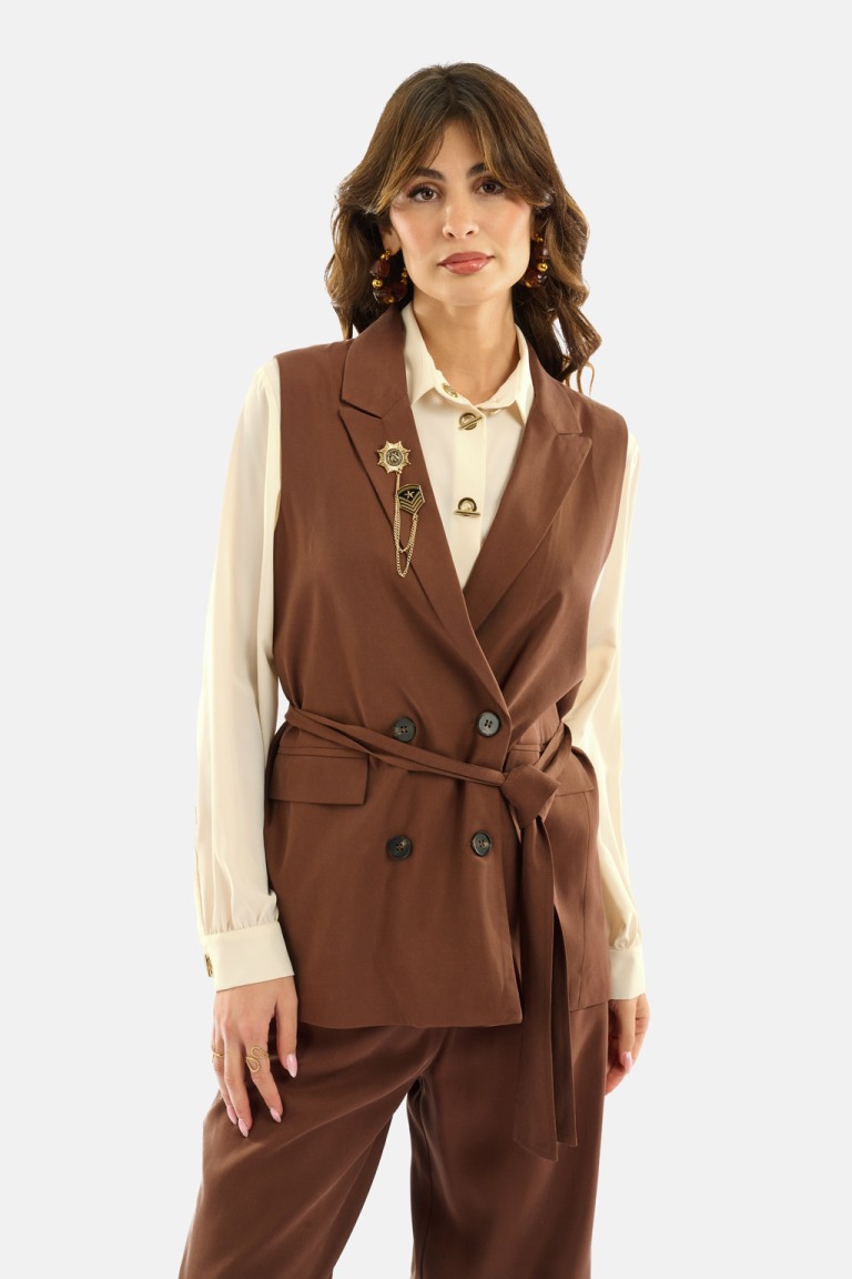 Gilet lungo doppiopetto realizzato in fluido twill di viscosa, con revers classici, patte con frisi decorativi e cintura in tessuto coordinato da annodare in vita. La linea strutturata valorizza la silhouette, mentre la spilla gioiello rimovibile aggiunge un tocco distintivo di carattere. Perfetto per creare outfit sofisticati e versatili