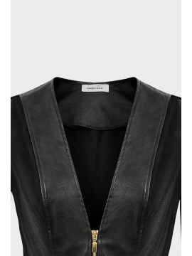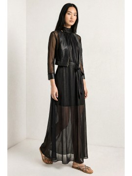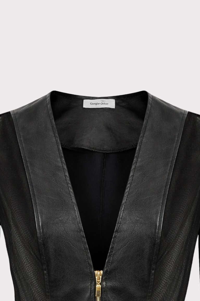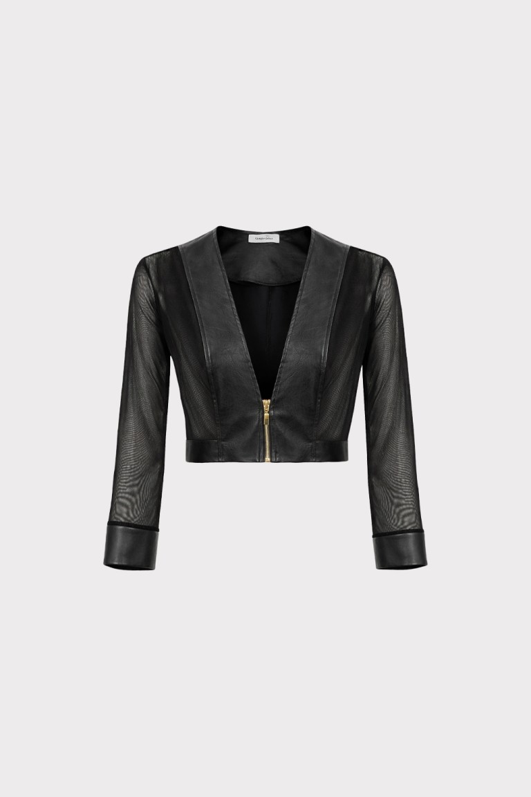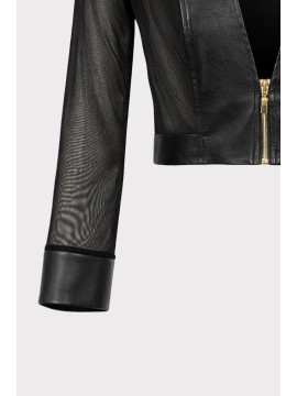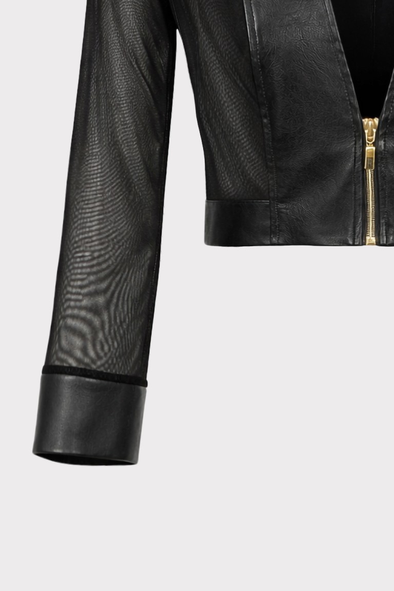 Giubbino corto dal design moderno e deciso, realizzato in ecopelle morbida con inserti in guaina trasparente che donano leggerezza e un effetto contemporaneo. Il contrasto tra la struttura dell’ecopelle e la trasparenza della guaina crea un capo femminile e di forte impatto visivo. Il modello cropped valorizza la silhouette, mentre la chiusura frontale con zip metallica aggiunge un dettaglio grintoso e moderno. La scollatura a V profonda e le maniche lunghe con inserti trasparenti definiscono una linea elegante e sensuale, perfetta per completare look fashion e outfit da sera.