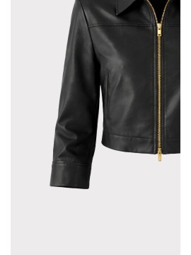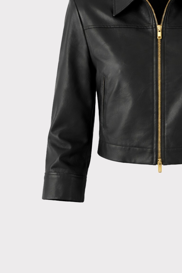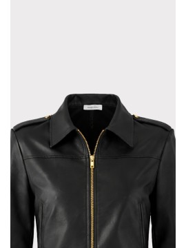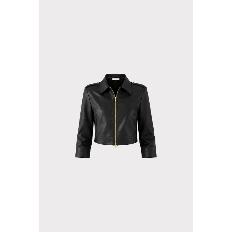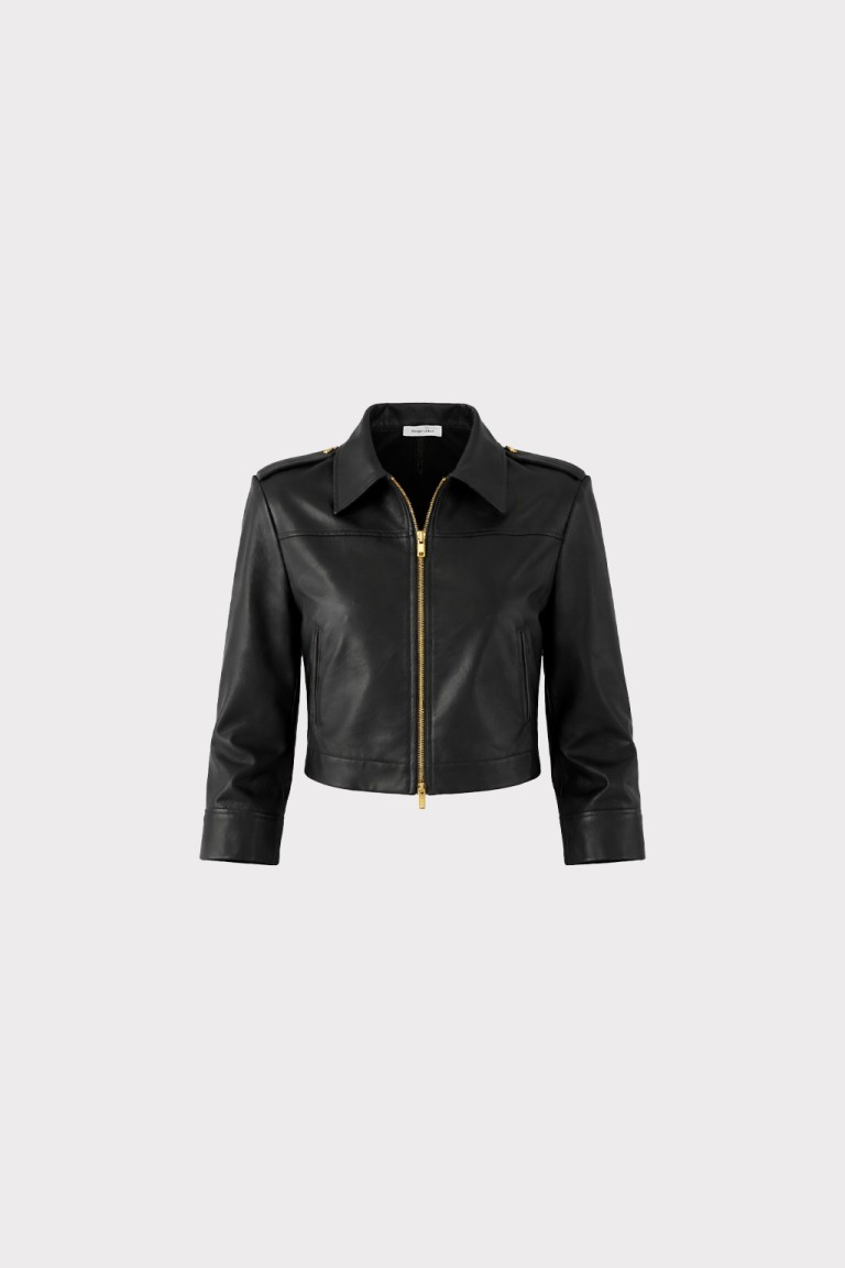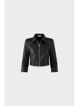 Giubbino corto in ecopelle morbida, caratterizzato da zip dorate e spalline con alamari per un tocco grintoso e raffinato. Il design minimal con colletto a camicia e tasche verticali dona un’allure contemporanea, perfetta per completare con stile look sia casual che eleganti