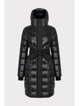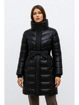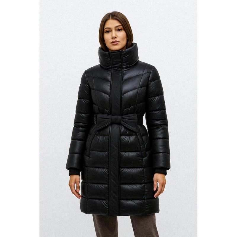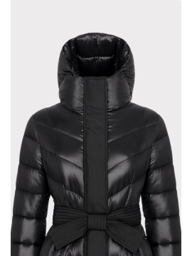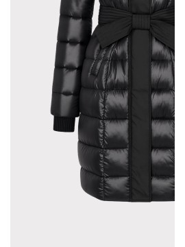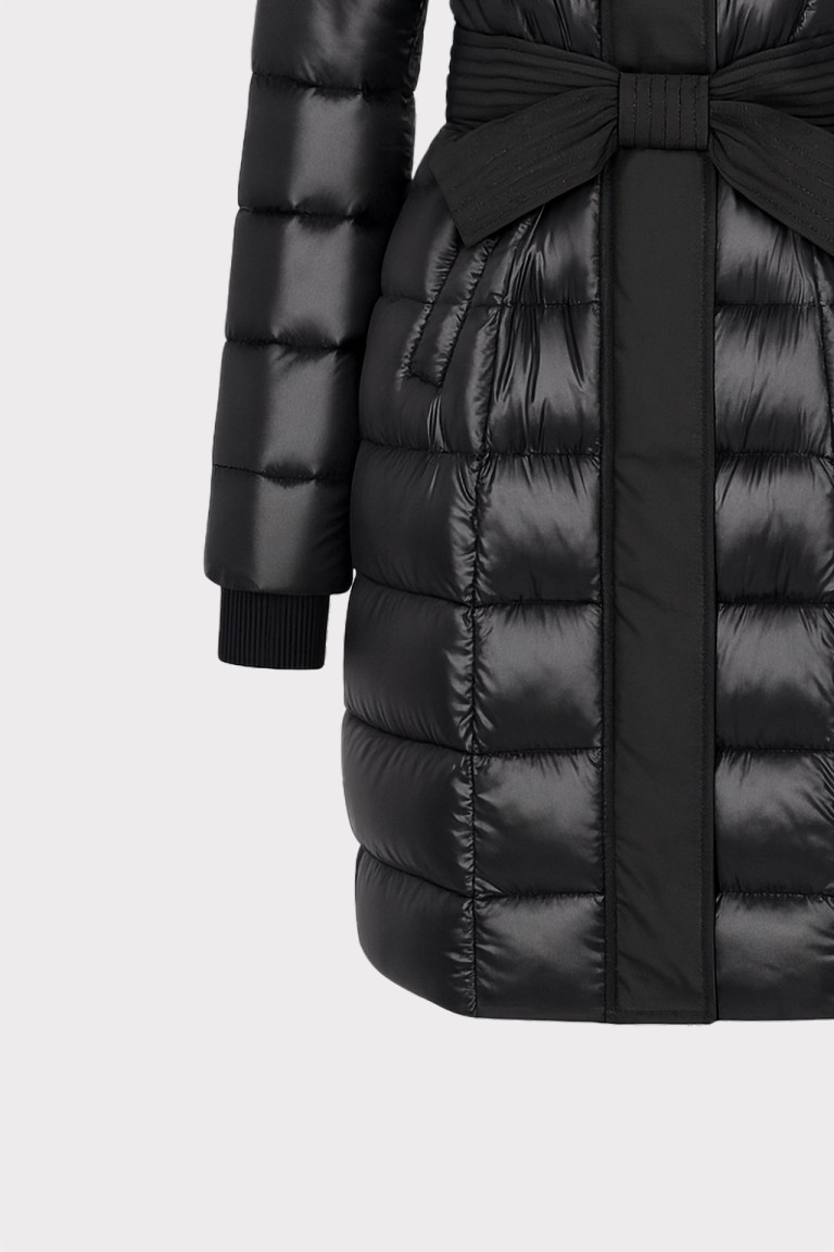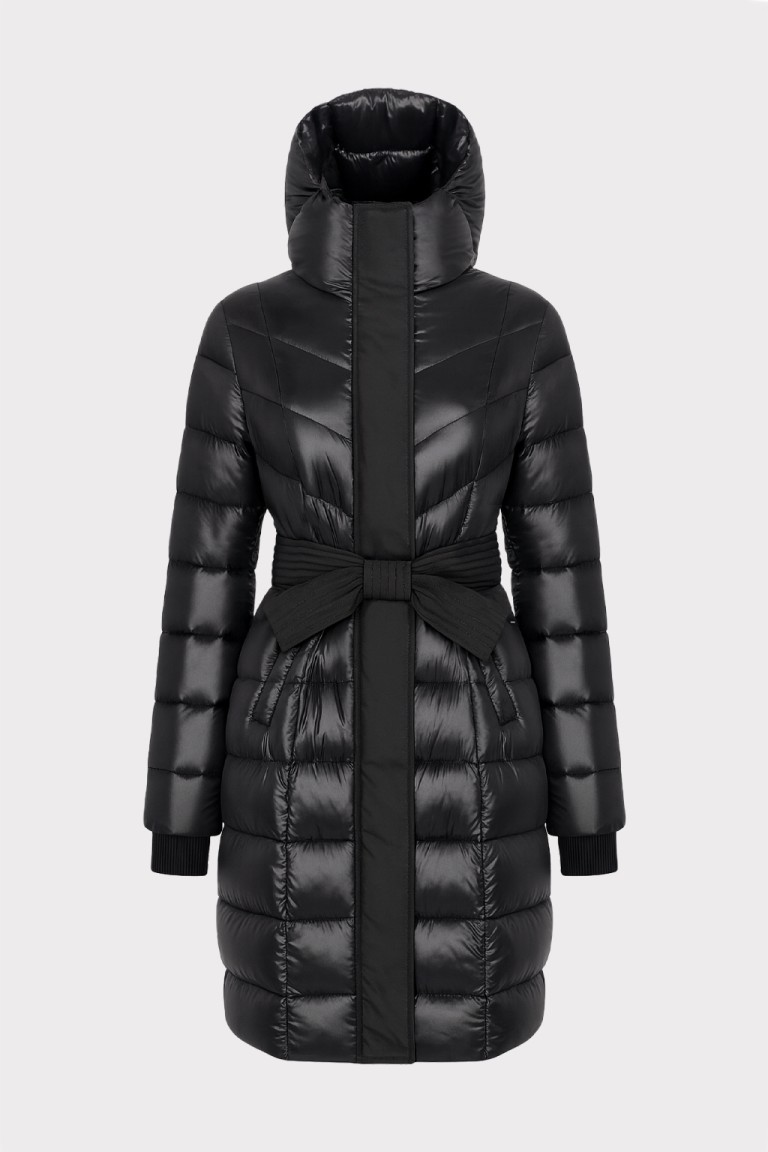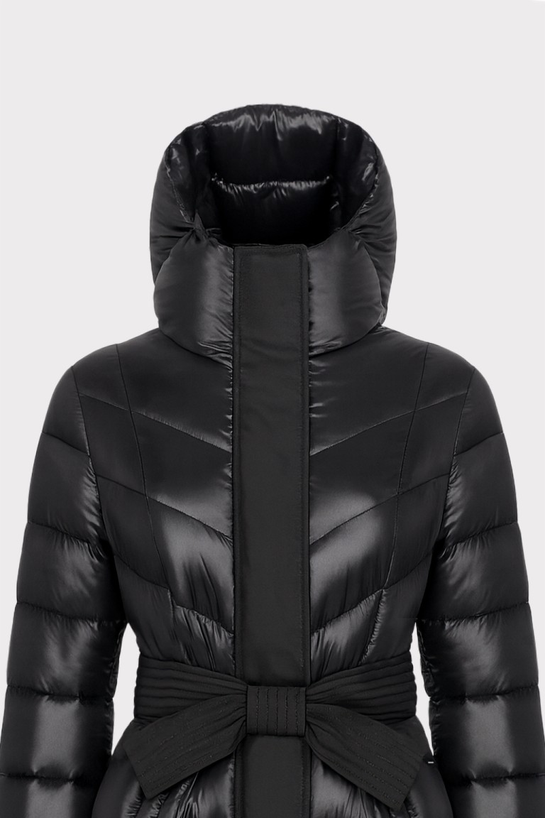 Piumino lungo da donna in tessuto tecnico lucido, perfetto per affrontare linverno con stile. Linea femminile e avvolgente, presenta una cintura in vita con dettagli di impunture in tessuto opaco, che valorizza la silhouette. Dotato di cappuccio e chiusura con zip e bottoni a pressione, offre comfort e protezione dal freddo. Un must-have versatile e glamour, ideale per look casual chic e citywear.