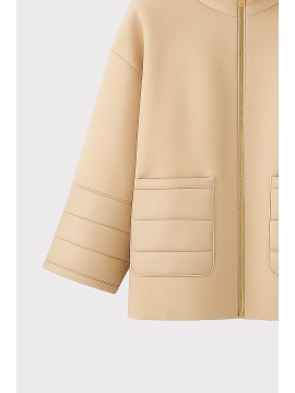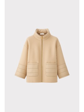 Giacca in tessuto effetto lana con inserti trapuntati su maniche e tasche frontali. Il design presenta una linea morbida, collo alto e chiusura con zip frontale. Calda e leggera, è ideale per la mezza stagione o per un look urbano raffinato. Lo stile pulito e i dettagli tecnici la rendono un capo versatile e confortevole, perfetto da abbinare sia a pantaloni eleganti che a jeans casual.